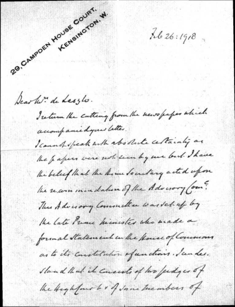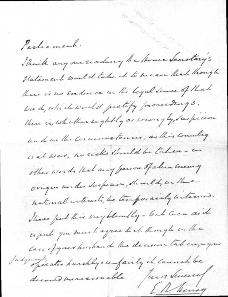 Edward Richard Henry, Commissioner of the Metropolitan Police, believes the Home Secretary acted upon the recommendation of the Advisory Committee and that his statement suggests "any person of alien enemy origin under suspicion", regardless of evidence, should be temporarily interned