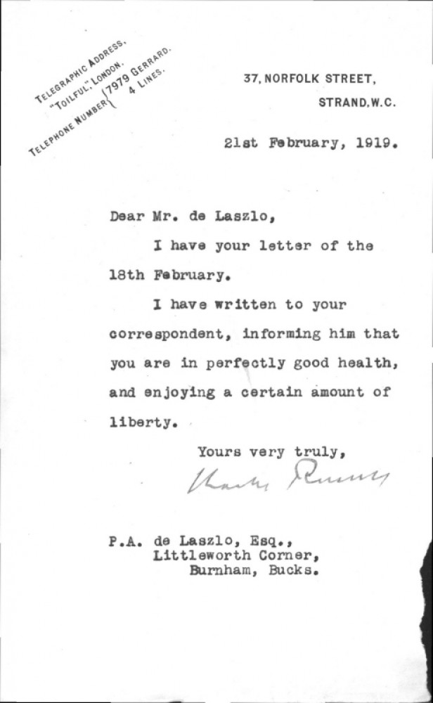 Charles Russell has informed de László's correspondent that the artist is in good health and "enjoying a certain amount of liberty" at Littleworth Corner