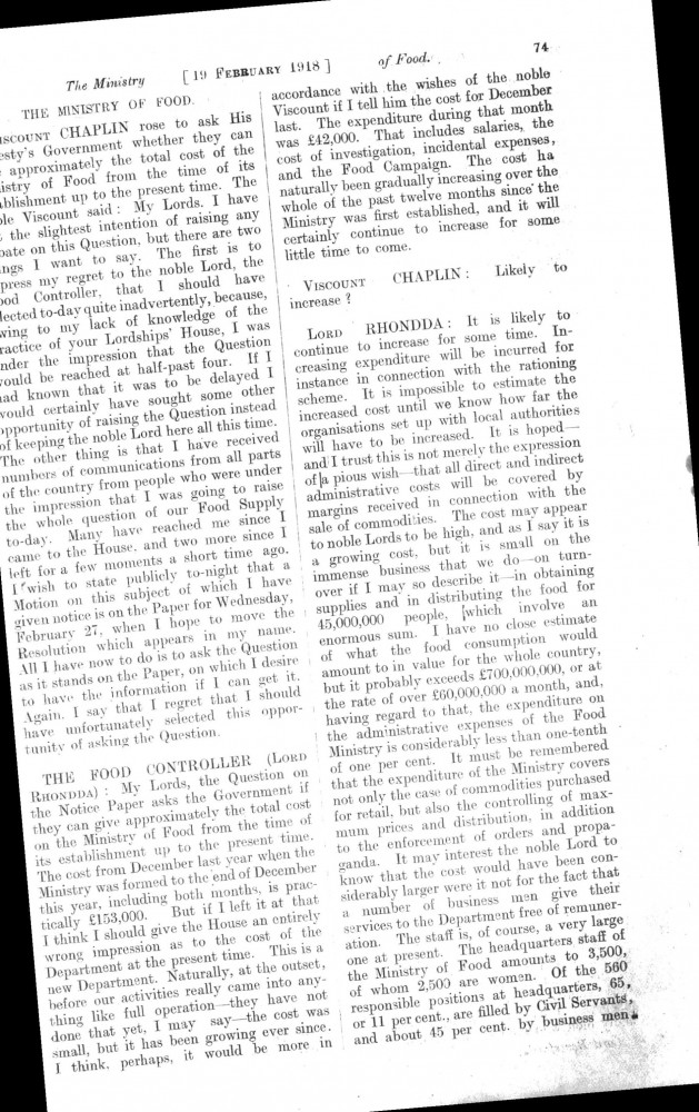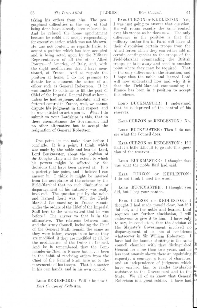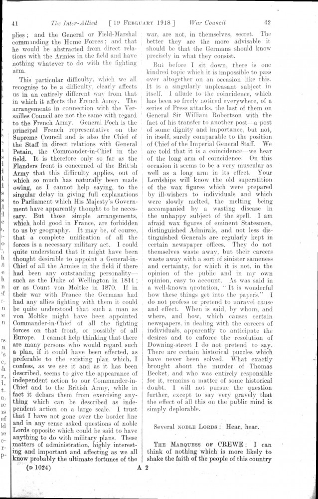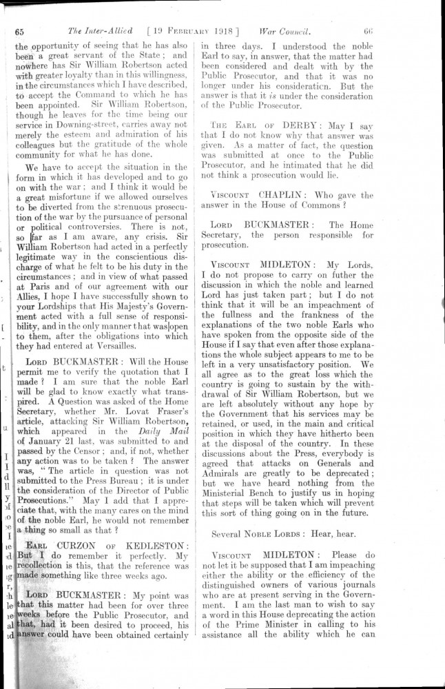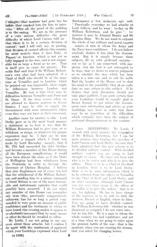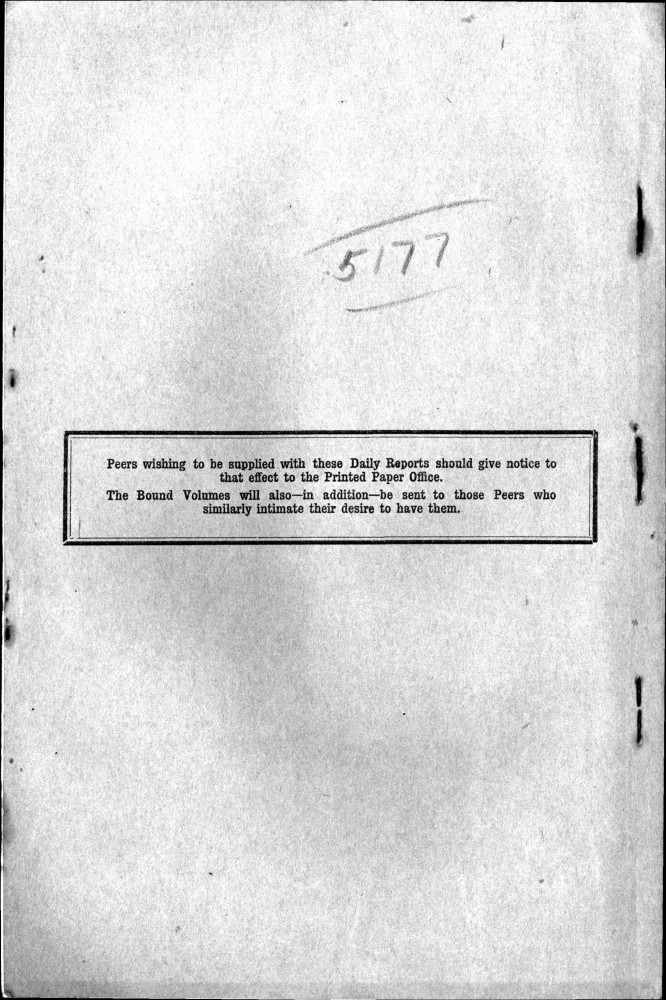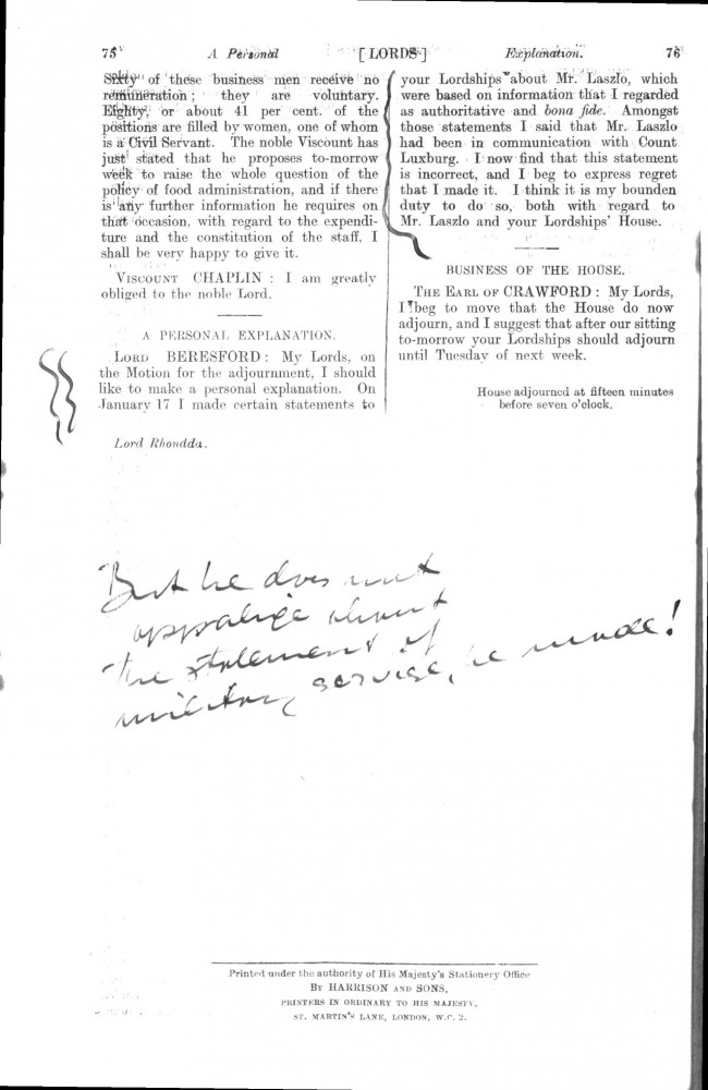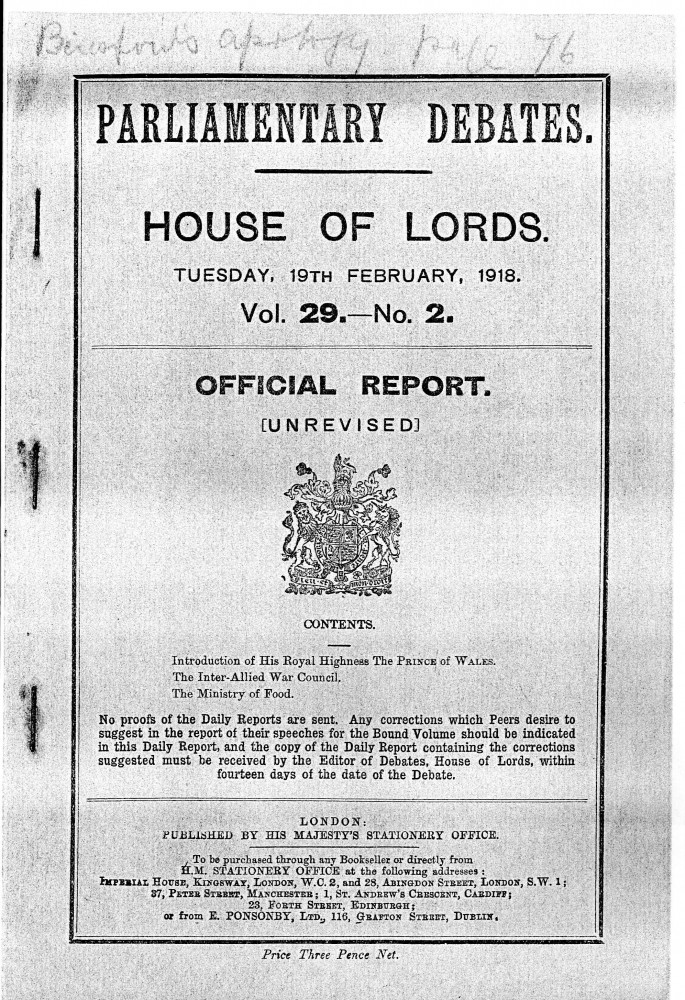 Parliamentary Debates. House of Lords. Tuesday, 19 February 1918. Vol. 29, No. 2. Official Report [unrevised]. Same report as contained in DLA167-0001 and DLA167-0002 but with handwritten annotations in the artist's hand. Annotation on the title-page: "Beresford's apology, p. 76". Annotation below columns 75-76: "But he does not apologise about the statement of military service, he made!".