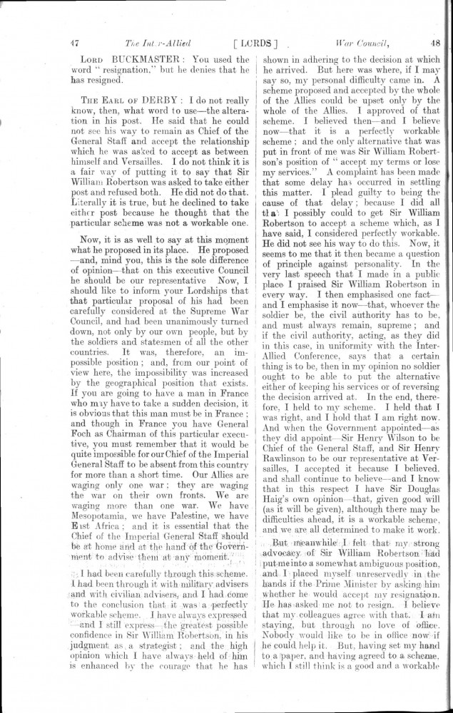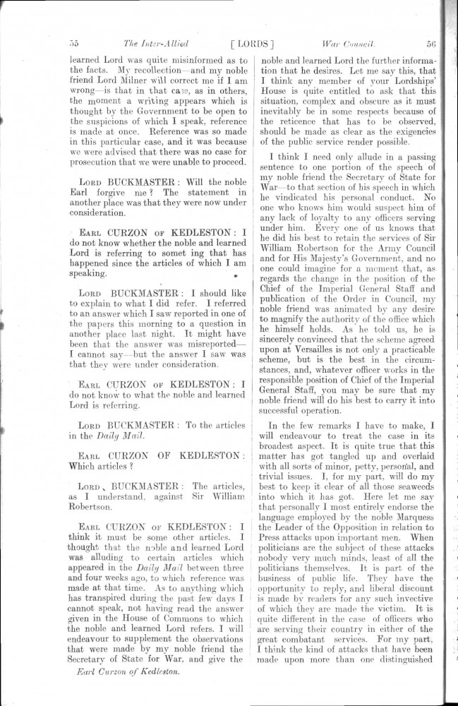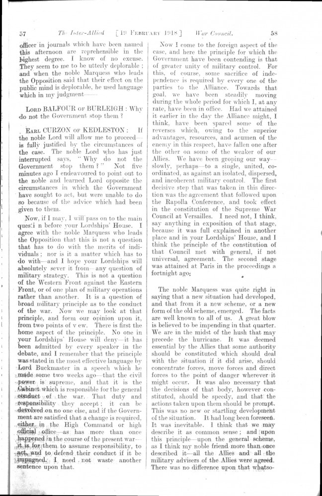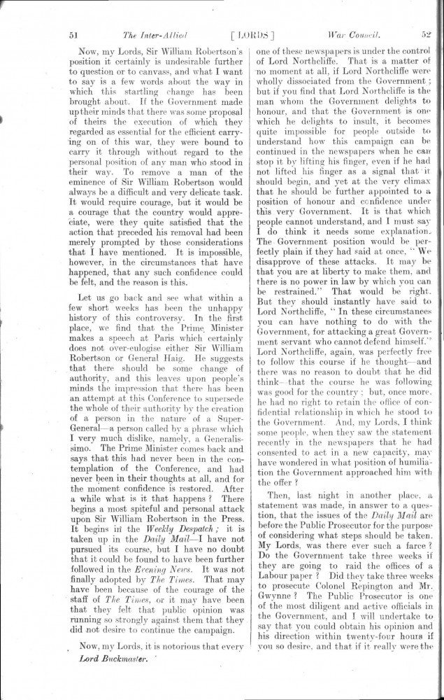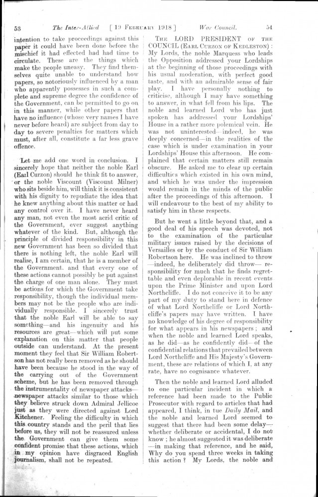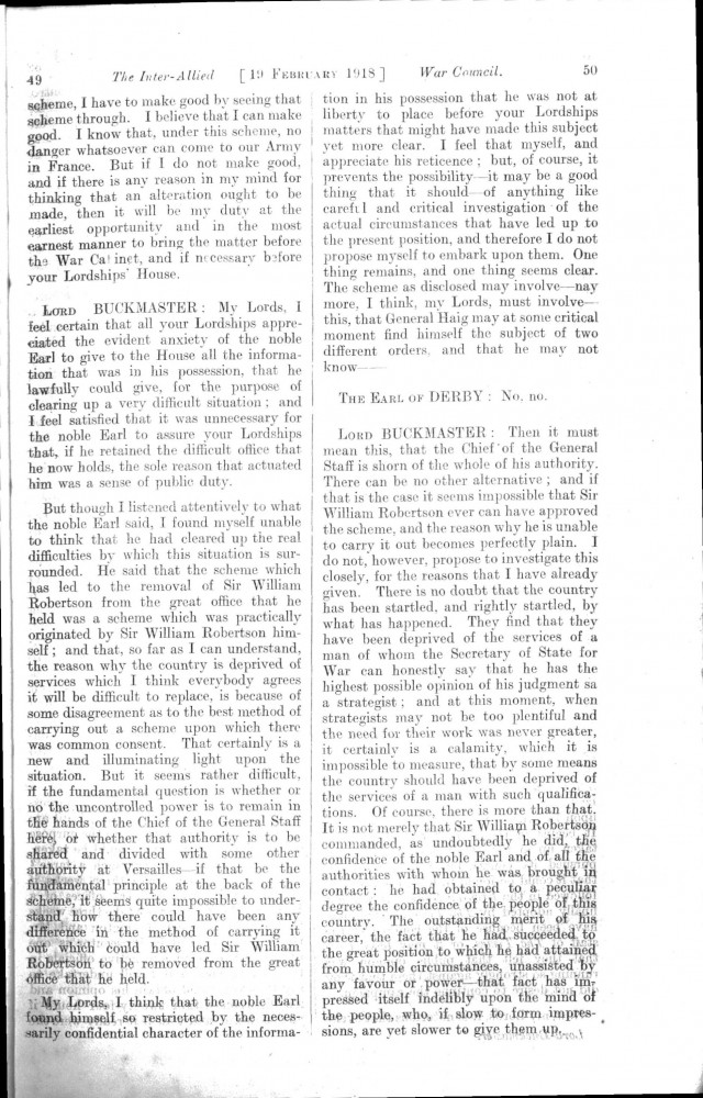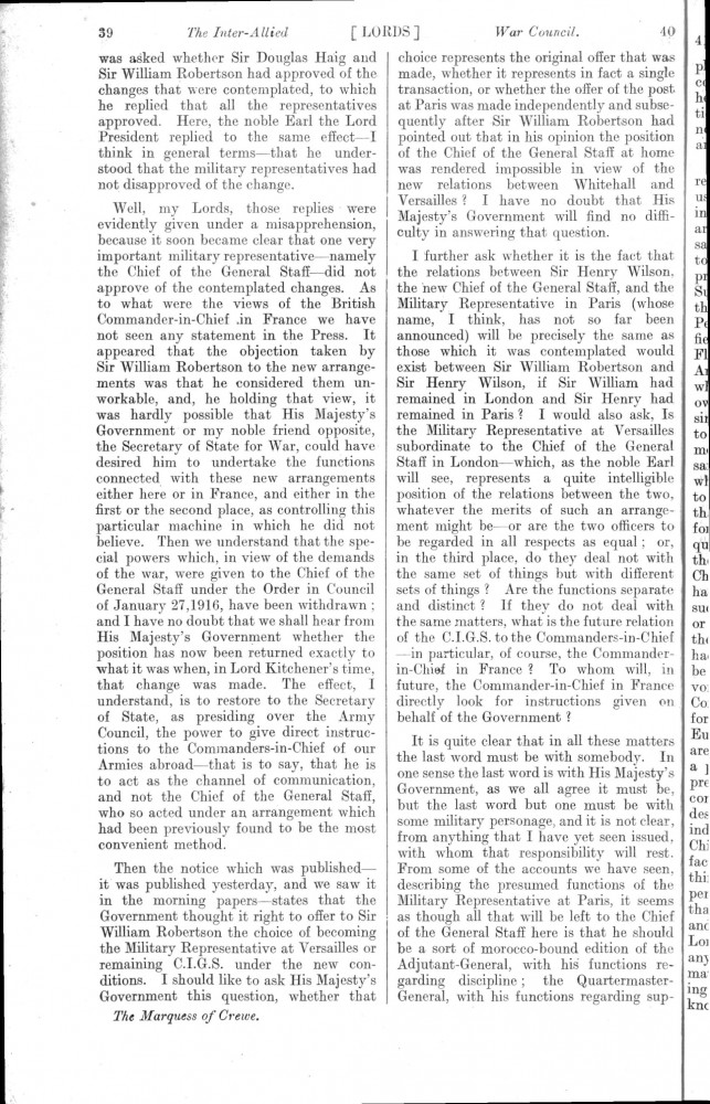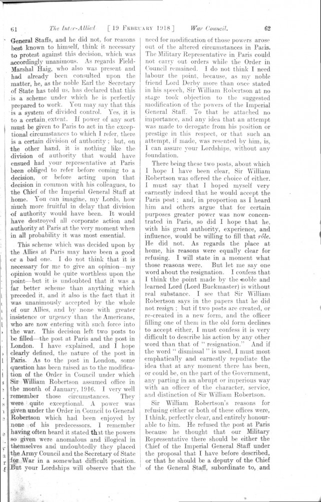 Parliamentary Debates. House of Lords. Tuesday, 19 February 1918. Vol. 29, No. 2. Official Report [unrevised]. Same report as contained in DLA167-0001 and DLA167-0002 but with handwritten annotations in the artist's hand. Annotation on the title-page: "Beresford's apology, p. 76". Annotation below columns 75-76: "But he does not apologise about the statement of military service, he made!".
