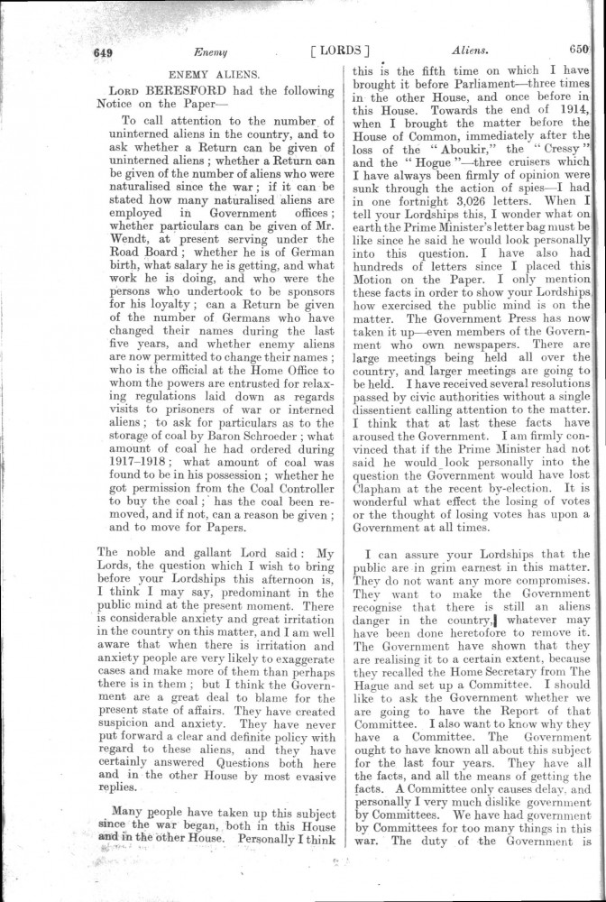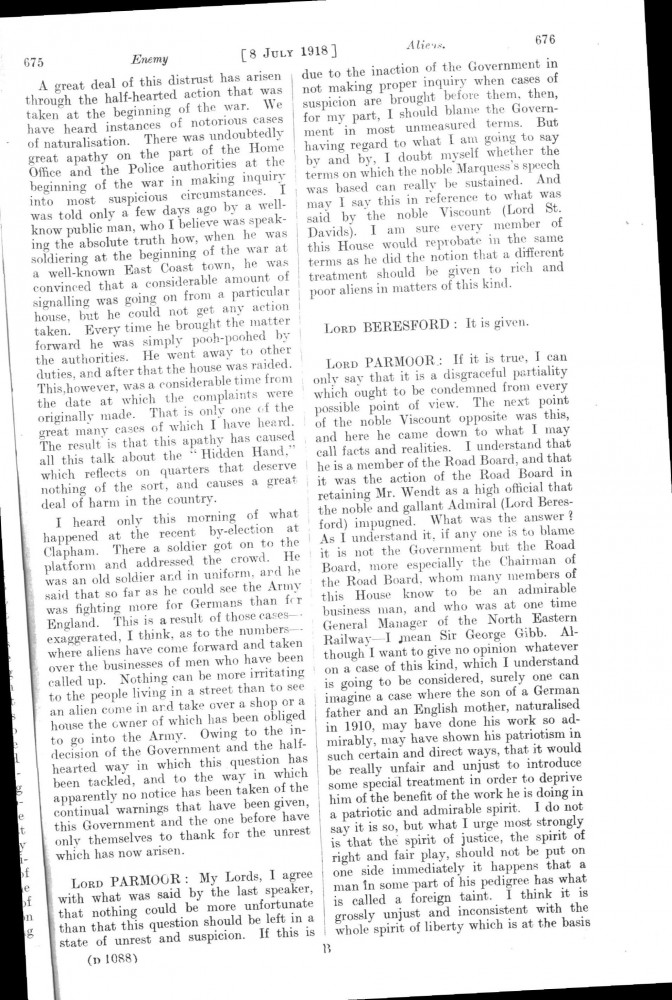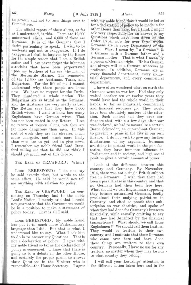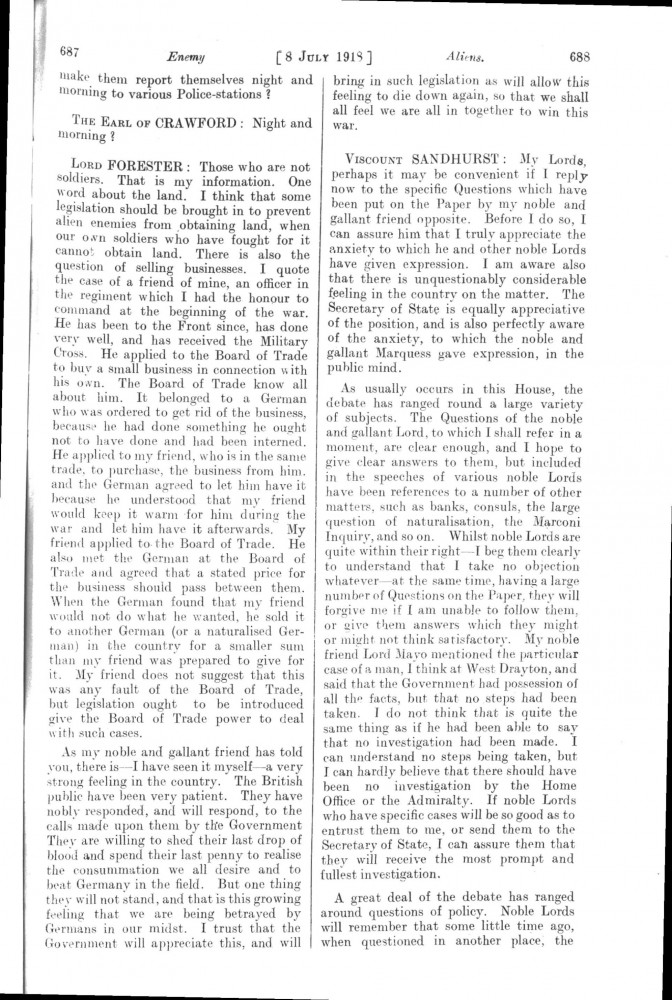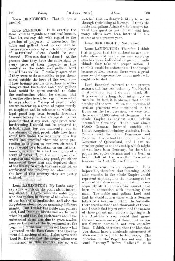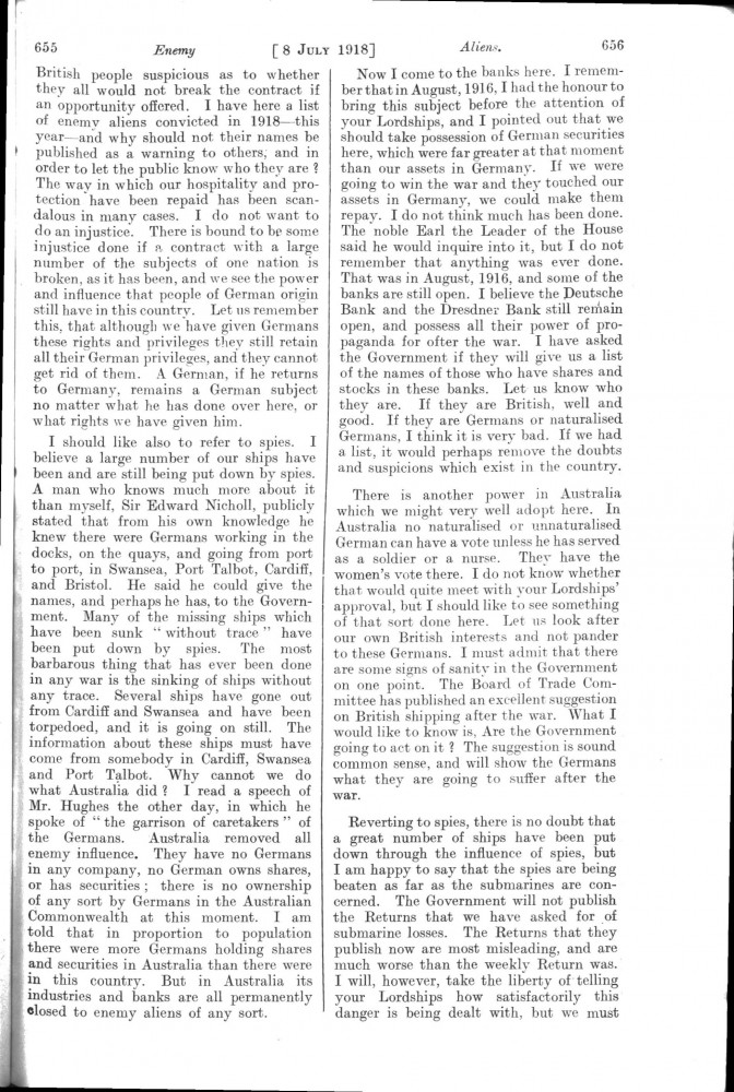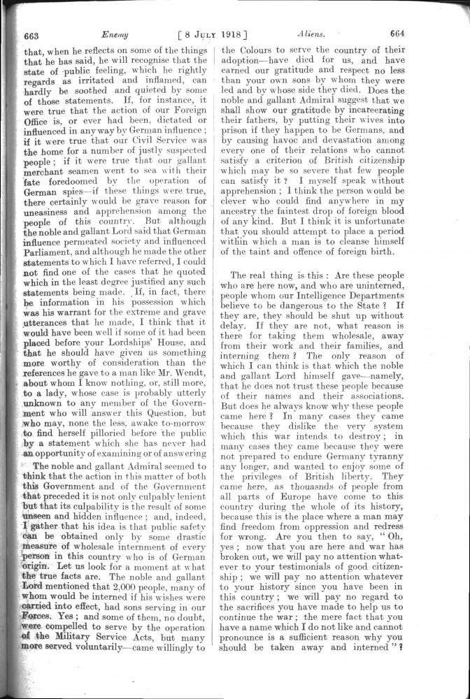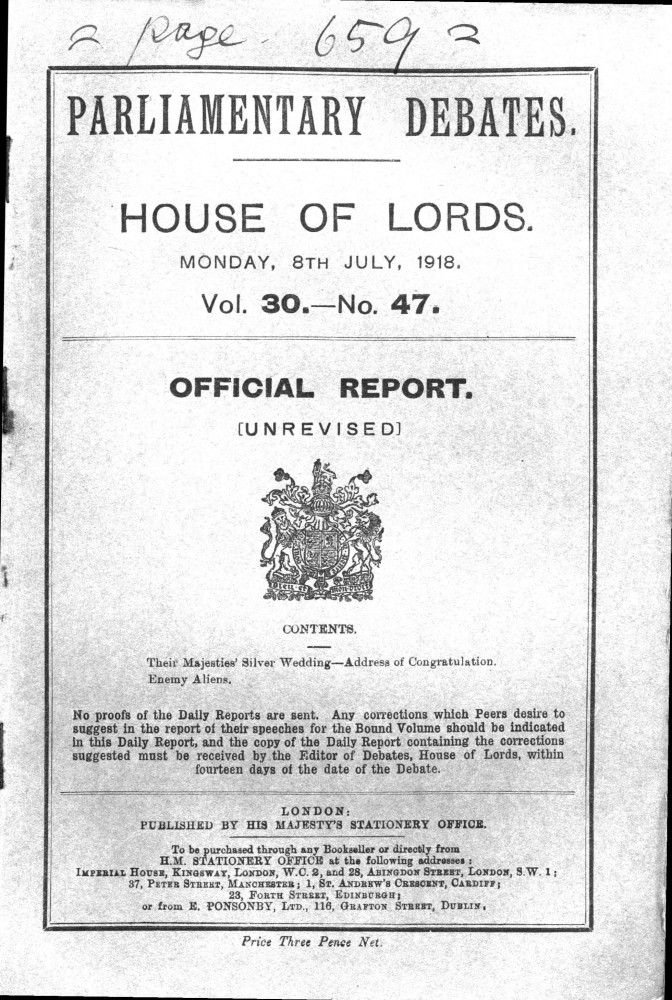 Parliamentary Debates. House of Lords. Monday, 8 July 1918. Vol. 30, No. 47. Official Report [unrevised]. See column 659.