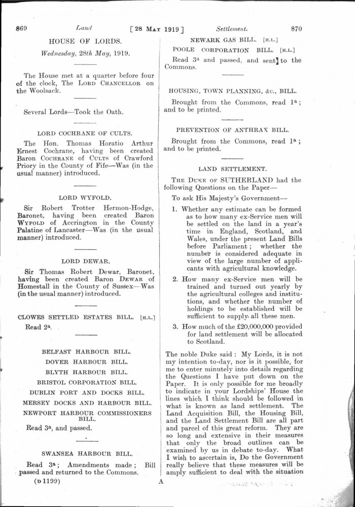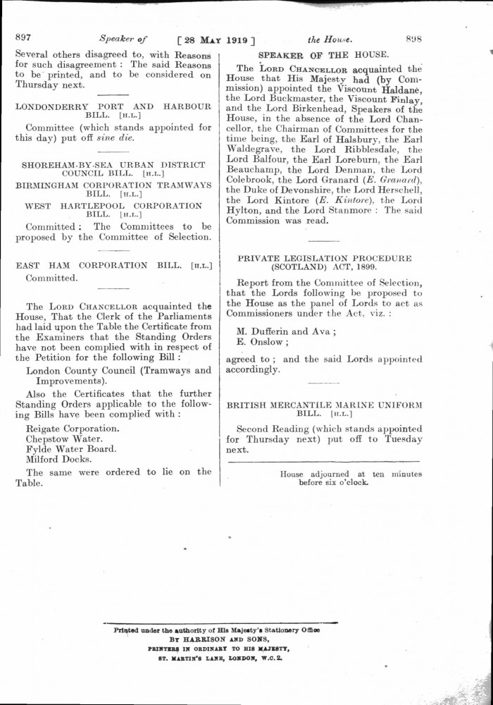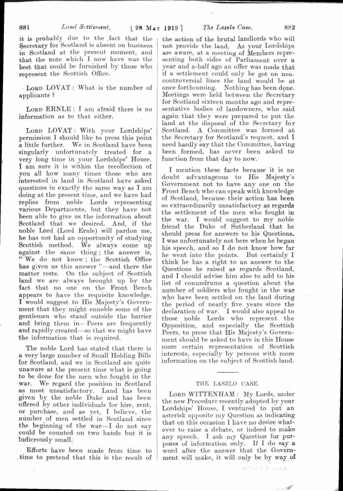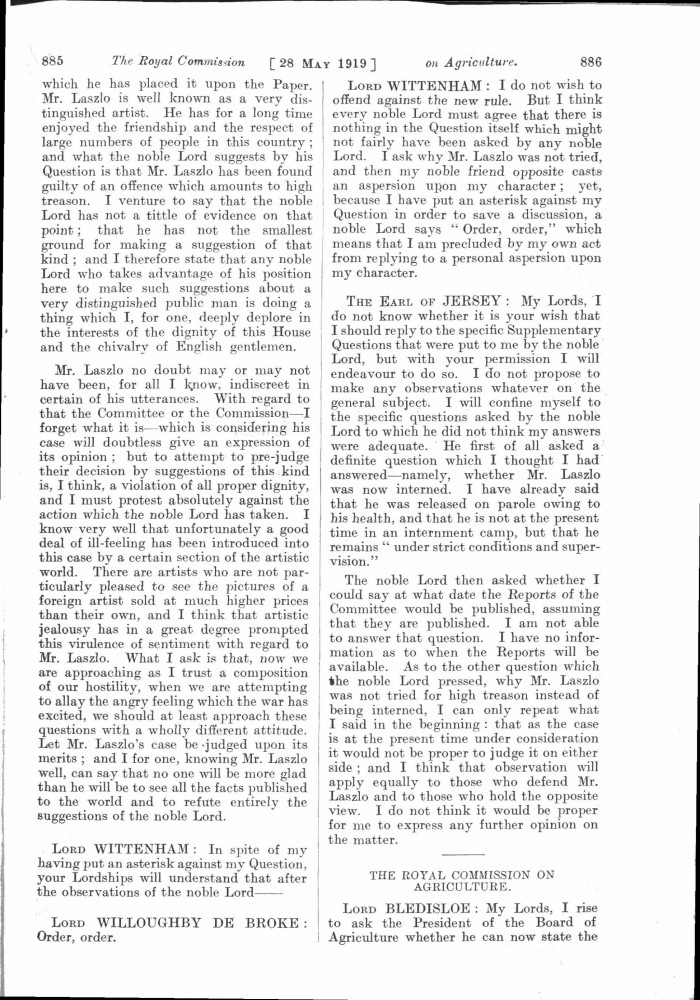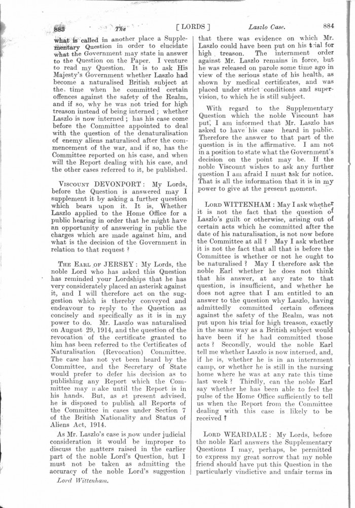 Parliamentary Debates. House of Lords. Wednesday, 28 May 1919. Vol. 34, No. 47. Official Report [unrevised]. See columns 882-886: "The Laszlo Case".