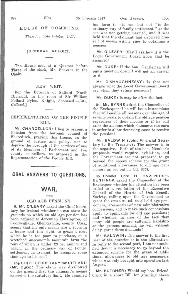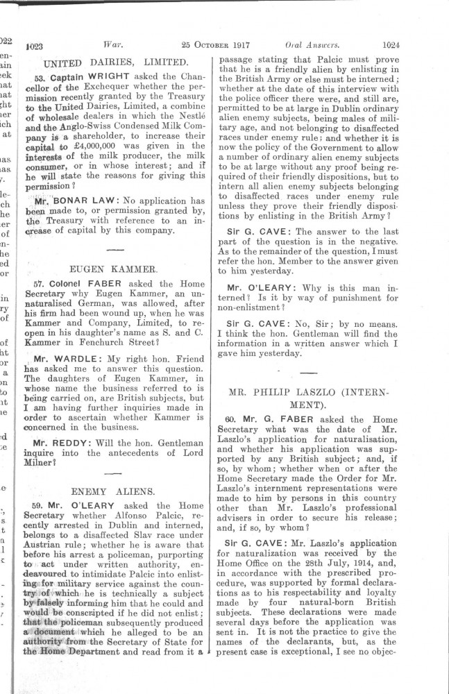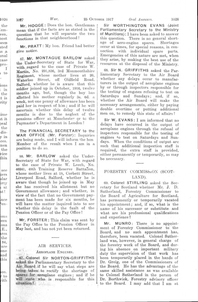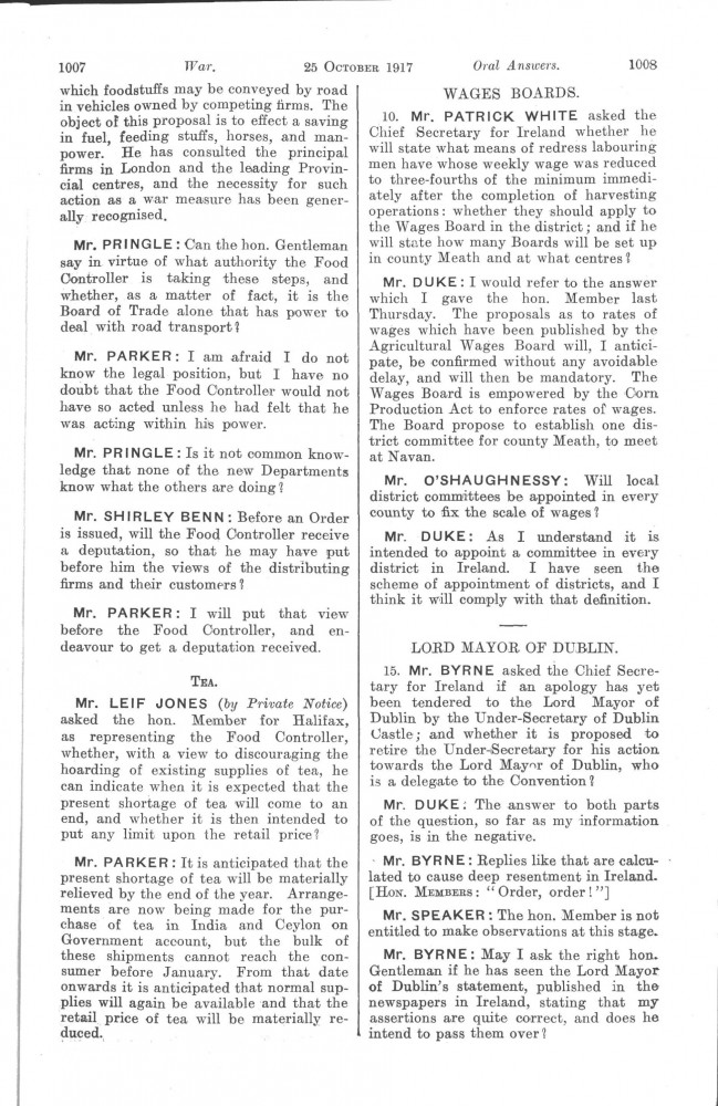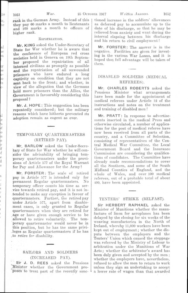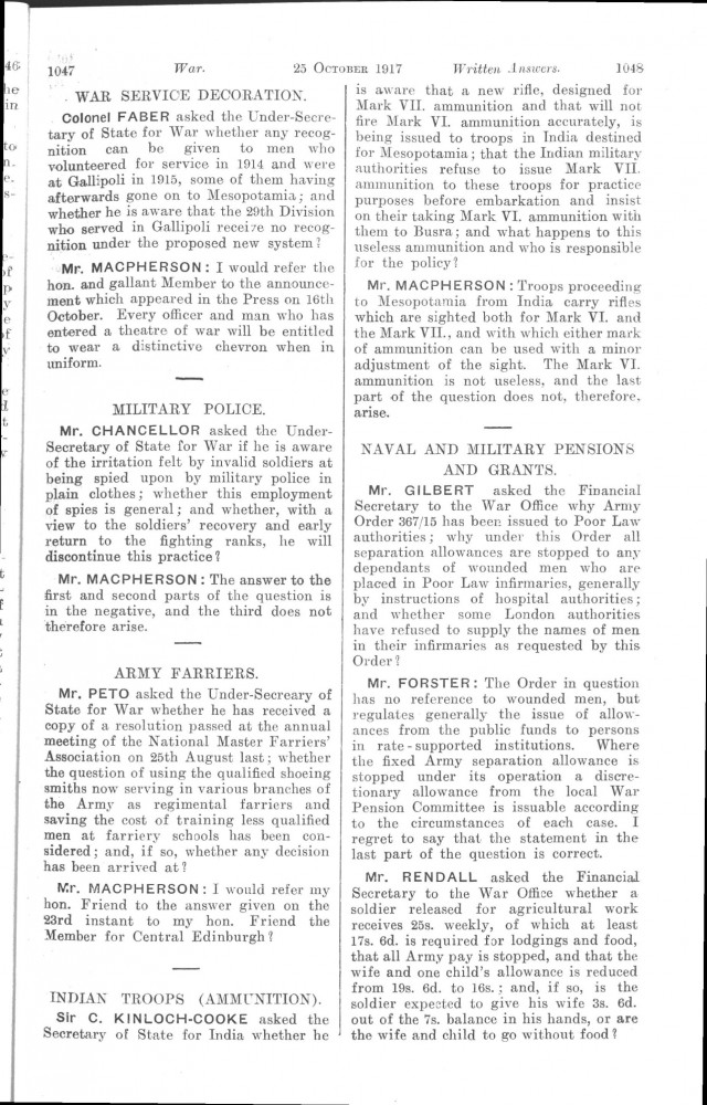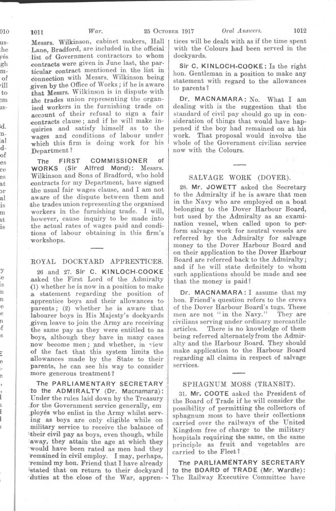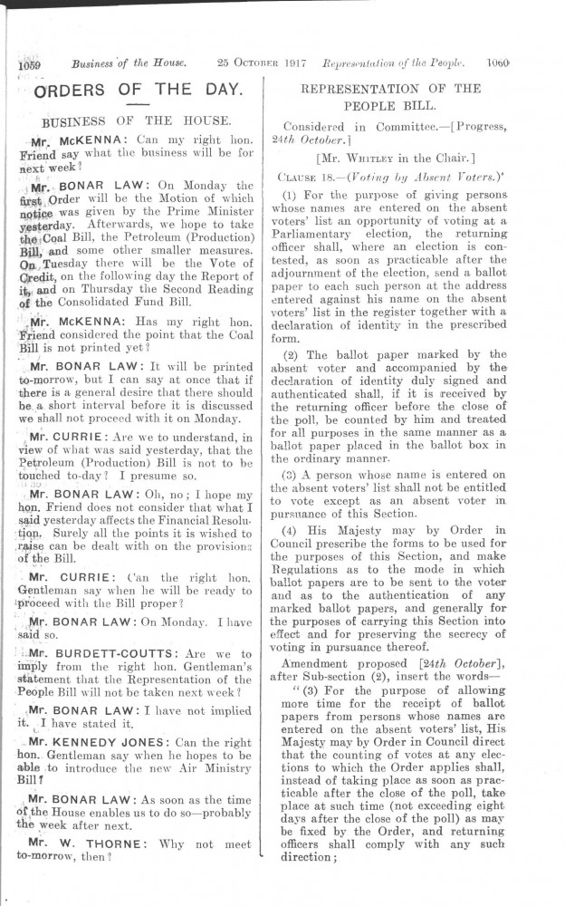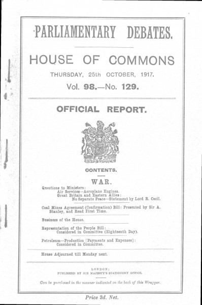 Parliamentary Debates. House of Commons. Thursday, 25 October 1917. Vol. 98, No. 129. Official Report. DLA167-0008 contains the same report.
