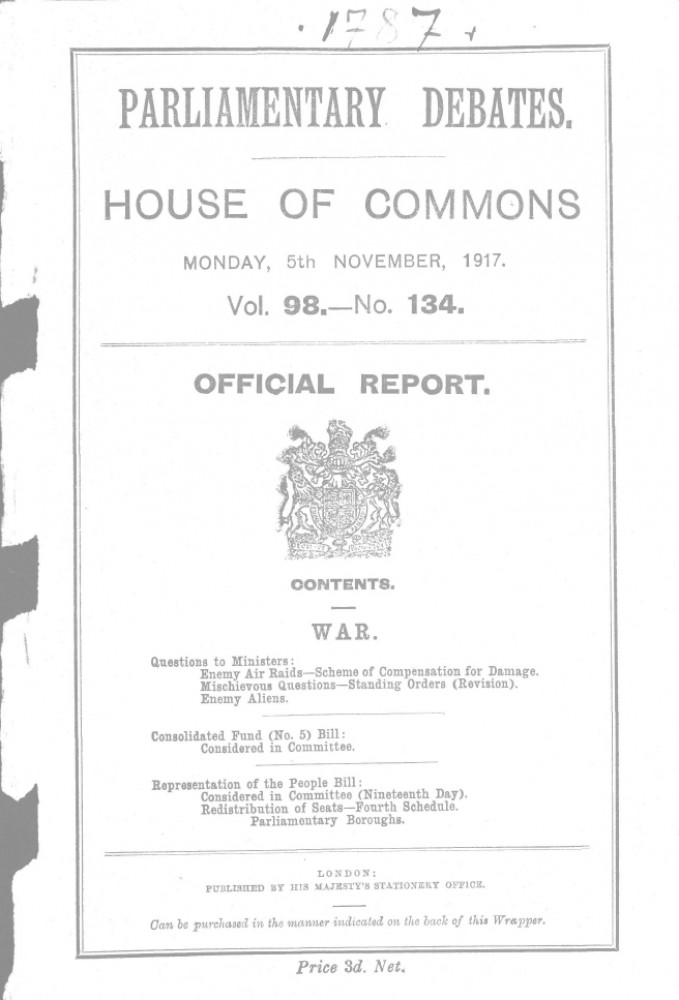 Parliamentary Debates. House of Commons. Monday, 5 November 1917. Vol. 98, No. 134. Official Report. Item consists of title page and a handwritten annotation on p.2 of PDF only.