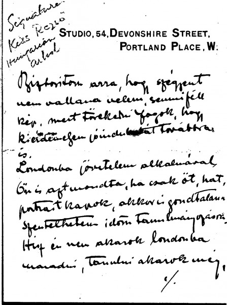 Partial letter from the Hungarian painter, Rezső Kiss, to de László in which he says he is in London studying. He has learnt that de László has recently overworked himself and, had he known, he would have offered to help (although it is not clear in exactly what way)