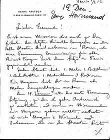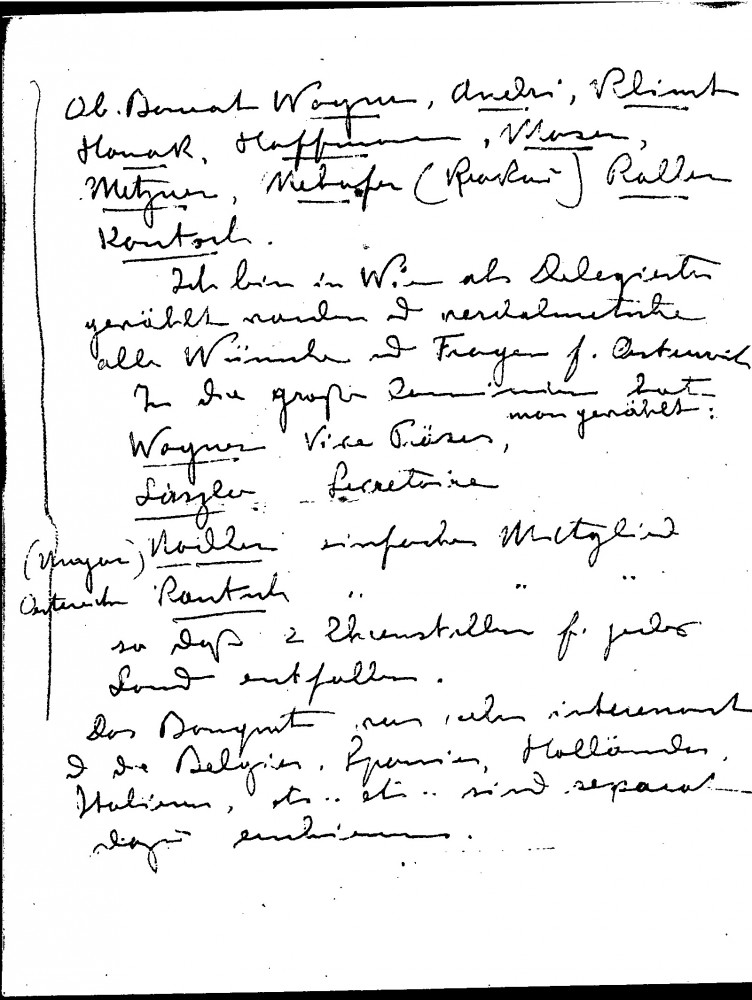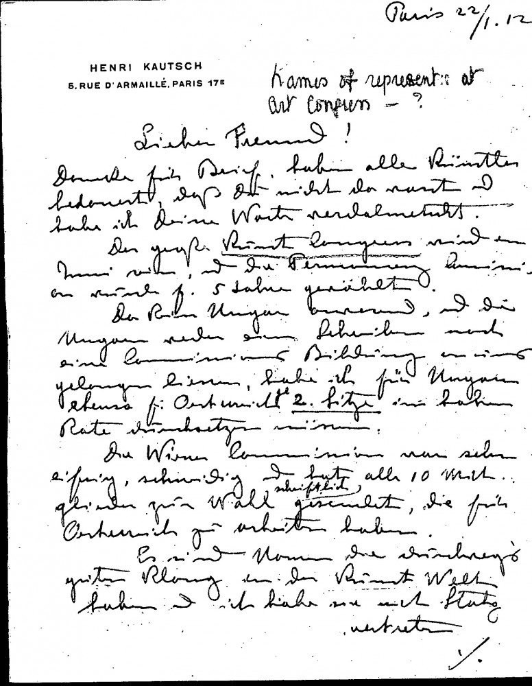 Kautsch attended the first "Permanency meeting" ahead of June's grand Art Congress, "a fraternisation from all artists from all countries". The other artists were sorry de László was not there; Kautsch spoke on his behalf. The Permanency Commission was elected for five years; there were no Hungarians present; the Viennese sent many well-known people (e.g. Klimt, Hoffmann); Kautsch was elected delegate in Vienna and de László as "Secretaire"; he will receive official notice.