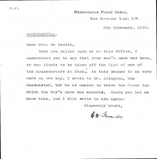 Basil Thomson has written to the headmaster at Eton concerning the removal of de László's son's name from one of the housemaster's lists.