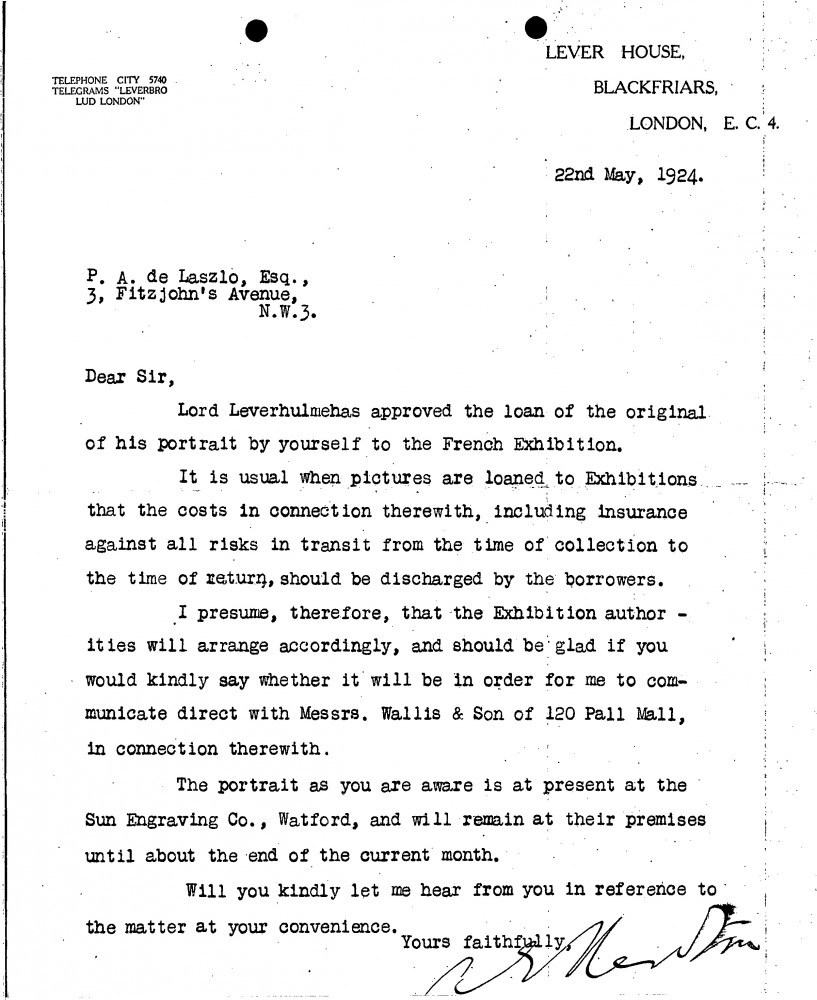 Confirming the willingness of Lord Leverhulme to lend his portrait [6043] for exhibition (French Gallery, June 1924).