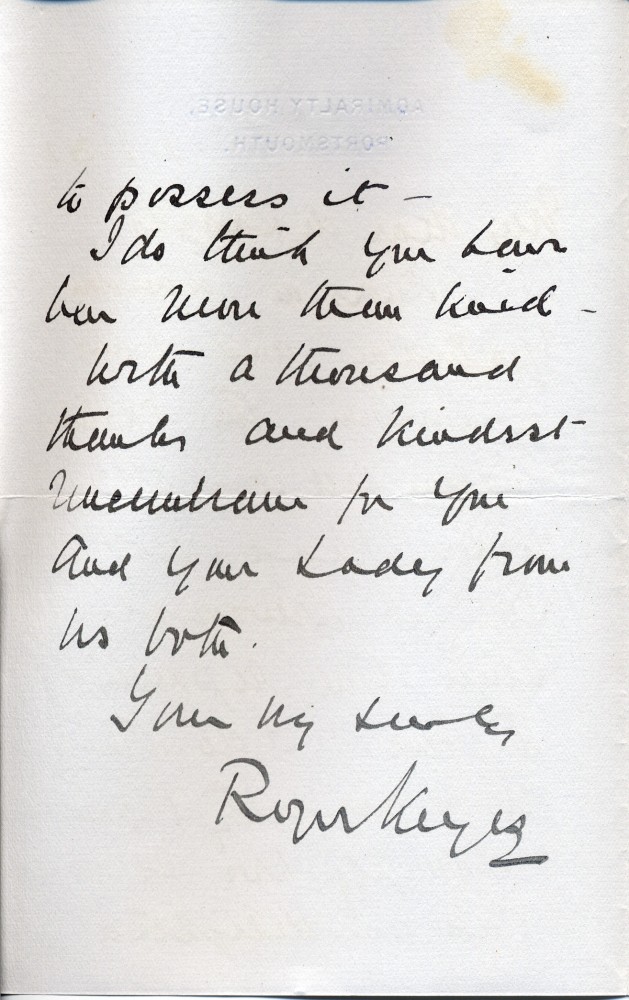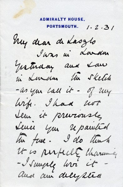 Admiral Sir Roger Keyes finds the altered sketch of his wife "perfectly charming" [5978]. Expresses delight in owning it, and thanks de László.
