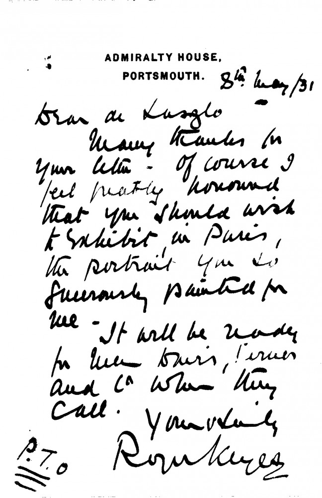 Letter from Admiral Sir Roger Keyes to de László, Exhibition Charpentier, Paris June 1931, 115-0100