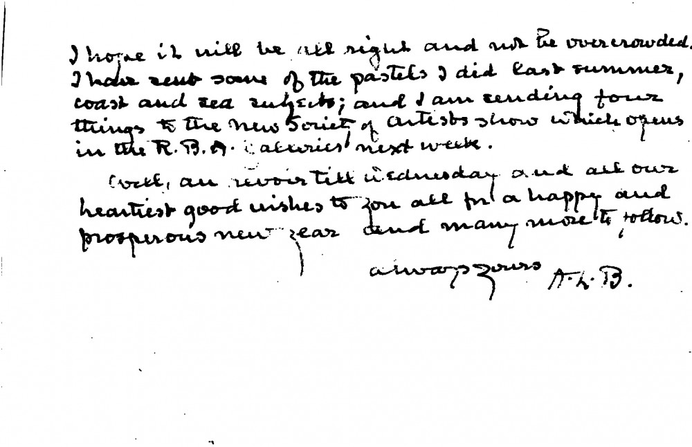Baldry hopes de László will keep his New Year's resolution to slow down. Baldry's wife is looking forward to sitting to de László [3559]; hopes to see de László at the Pastel Society private view, to which he has sent some work; has also sent work to the New Society of Artist's exhibition.