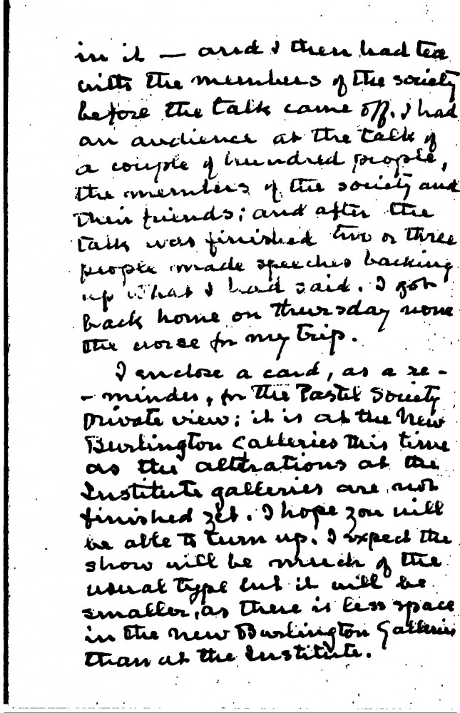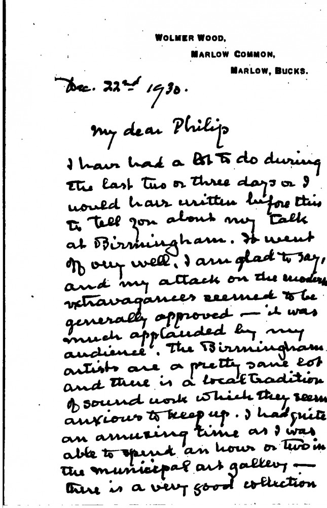 Letter largely concerning a lecture Baldry delivered to the Royal Birmingham Society of Artists in which he attacked "modern extravagances"; mentions the private view of the Pastel Society's exhibition; refers to sittings for de László's portrait of his wife [3559].