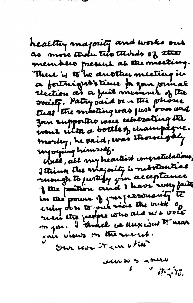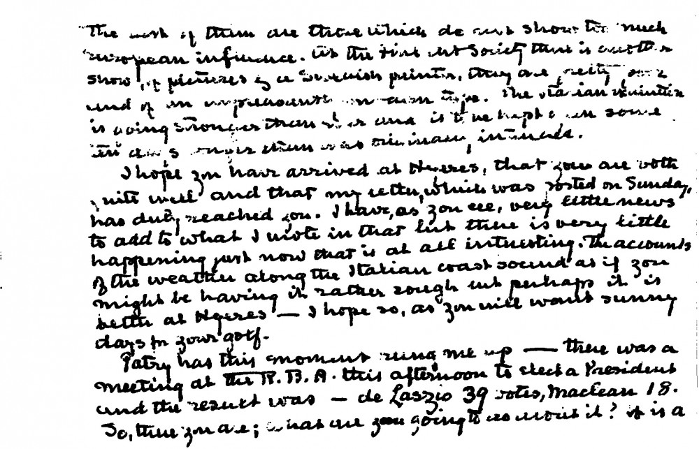 Letter largely concerning de László's successful election as president of the RBA; another meeting will be held shortly to elect him a full member of the society. Baldry mentions some recent London exhibitions.