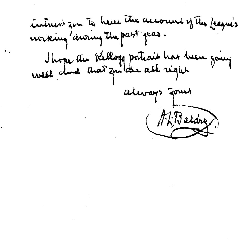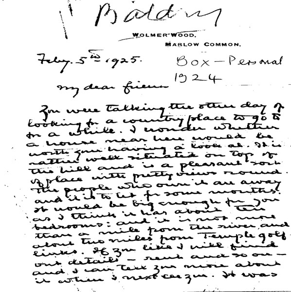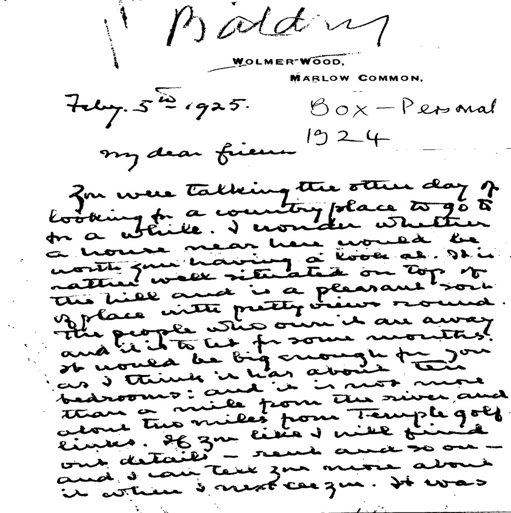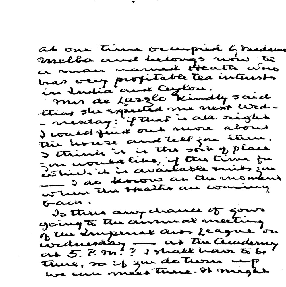Baldry suggests a country house near him for de László to consider, mentions the Imperial Arts League annual meeting, and inquires about progress on the Kellogg portrait [5915].