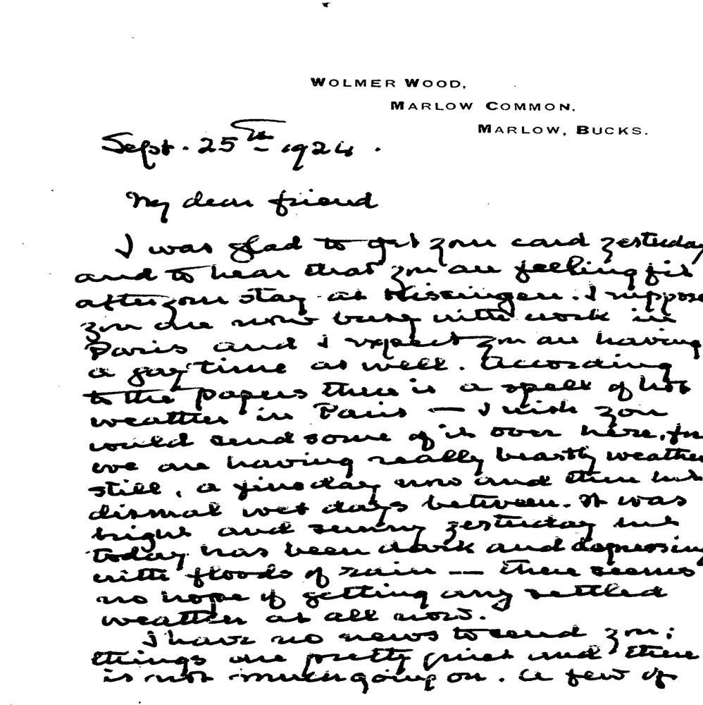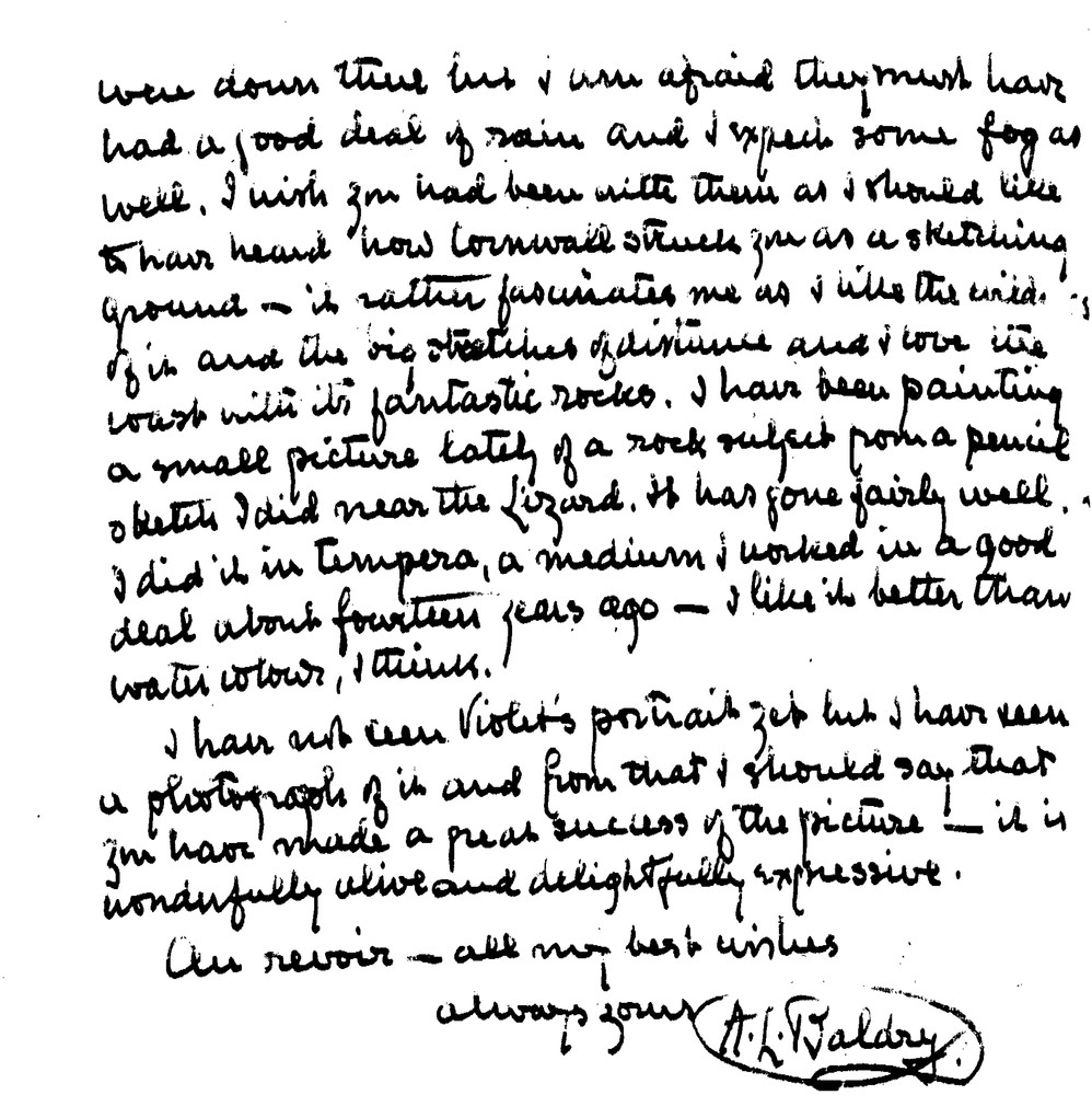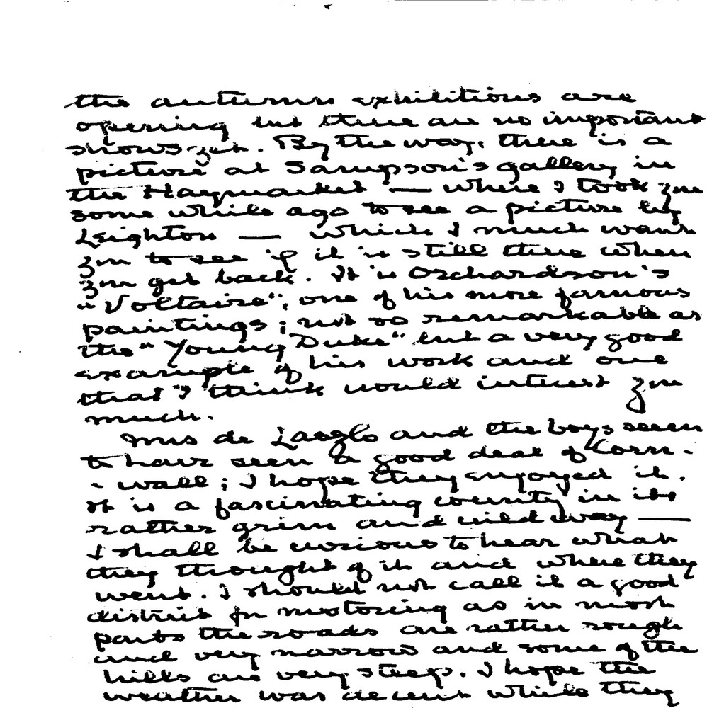 Baldry writes to de László after his return from Kissingen, pleased at his restored health and work in Paris, commenting on the lack of major exhibitions, recommending Orchardson’s Voltaire at Sampson’s Gallery, reporting on his own recent tempera painting, and praising the portrait of Violet as highly successful.