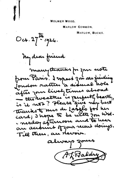 Brief letter from Baldry thanking de László for his note from Paris and anticipating a meeting.