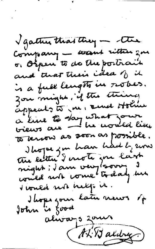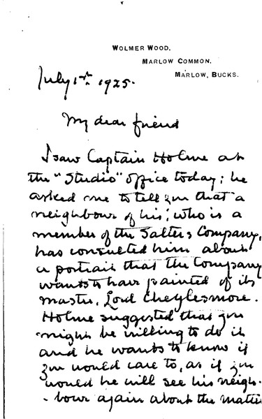 Baldry informs de László that the Salters Company is seeking a portrait of its Master, Lord Cheylesmore; de László or Orpen have been suggested for a full-length commission.
