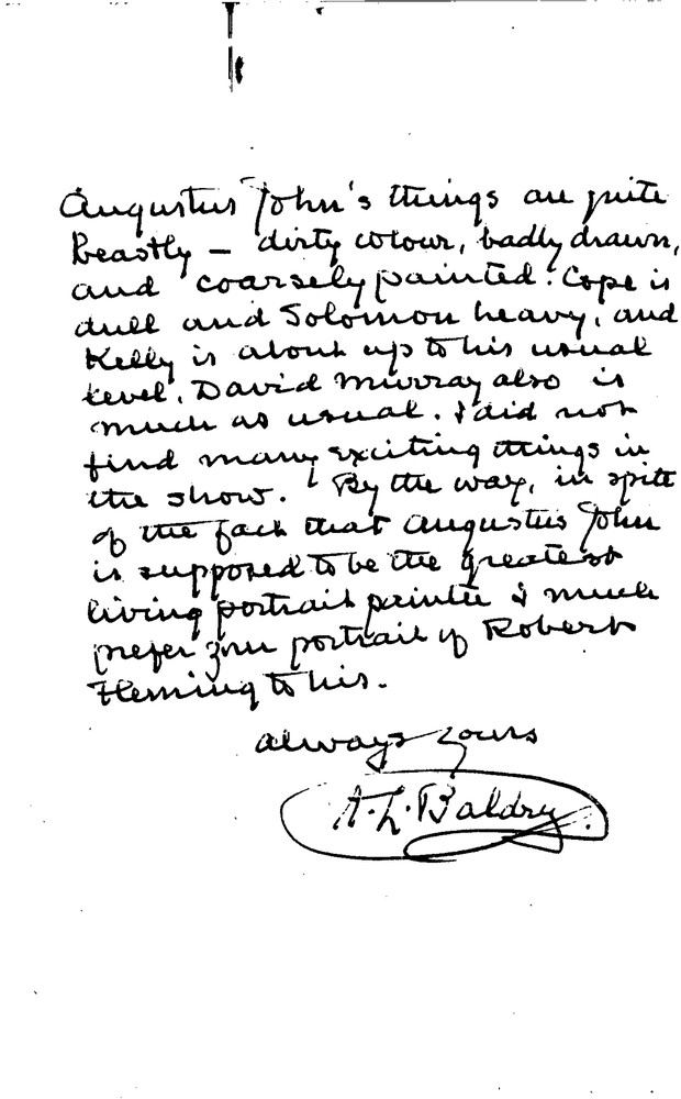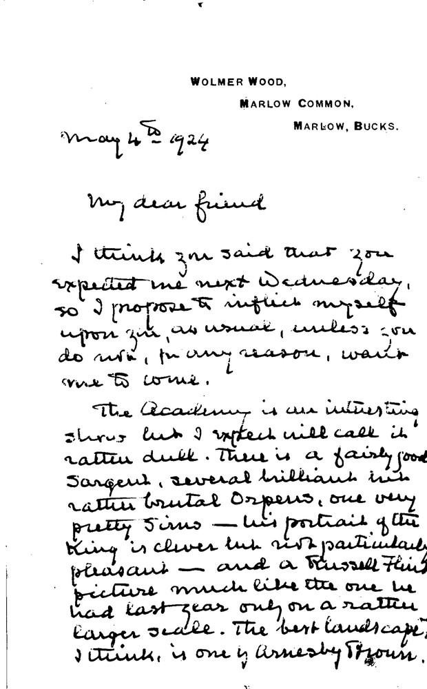 Baldry confirms his planned visit and shares his impressions of the Royal Academy exhibition, praising a few works but finding most uninspiring. He particularly criticises Augustus John and notes that he prefers de László’s portrait of Robert Fleming [5083] to John’s.