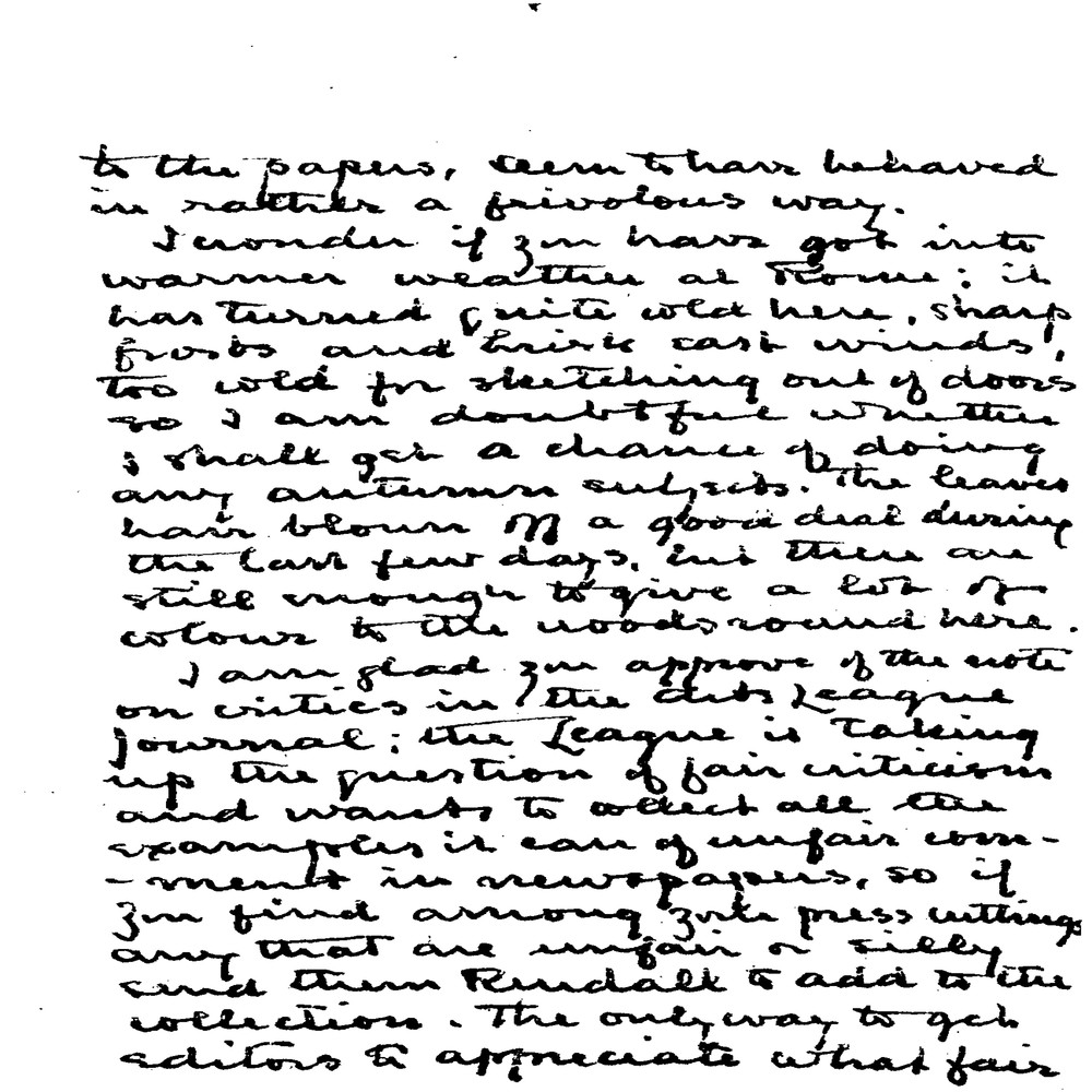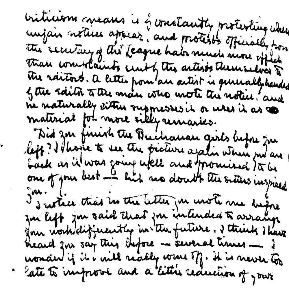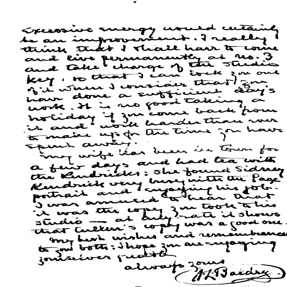 Baldry comments on de László’s recent travels, a royal wedding, and the Arts League’s efforts to promote fair criticism. He inquires about the Buchanan Girls' portrait [3637], rebukes de László for overworking, and notes that Sydney Kendrick is producing a copy of de László’s portrait of Walter Hines Page [111838], working from Cullen’s copy [111839] rather than the original [6498].