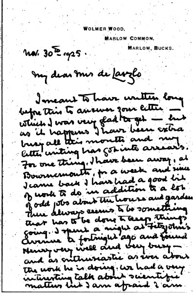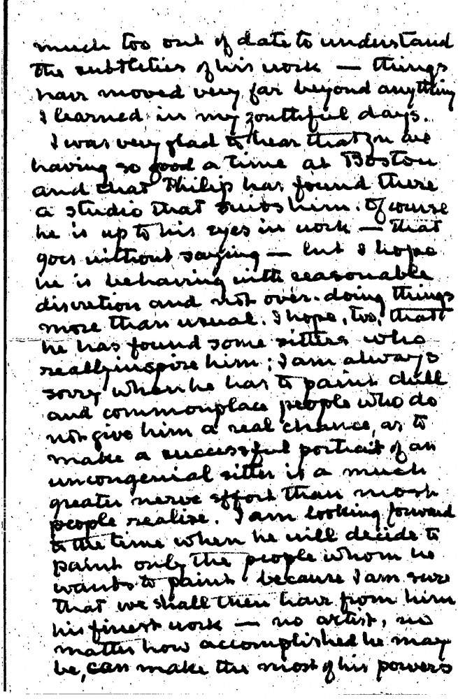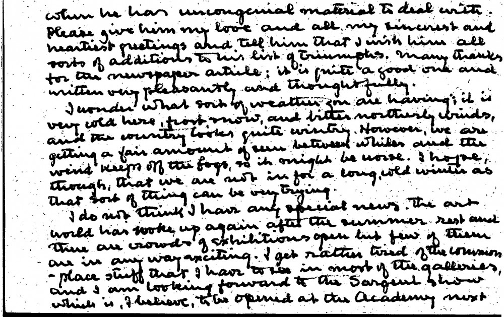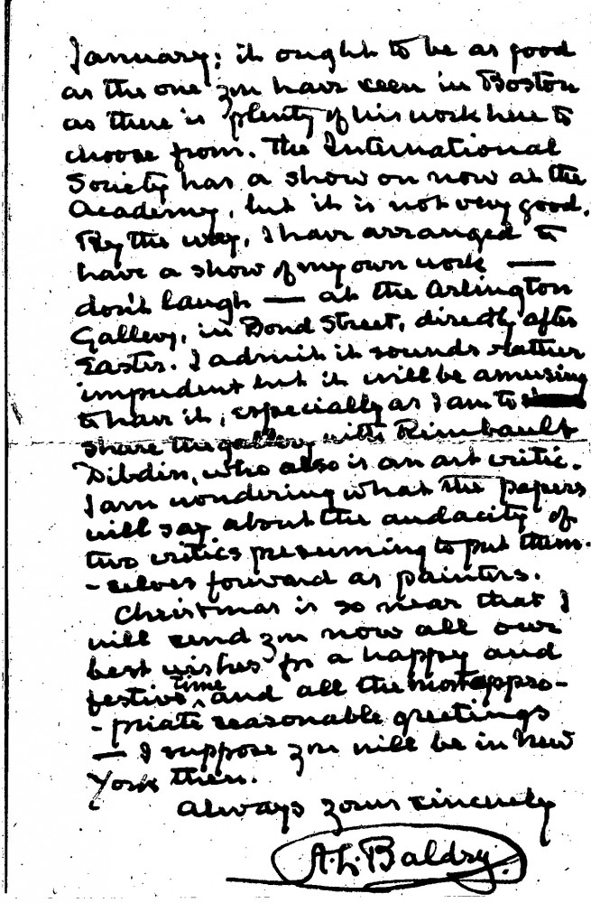 Baldry shares personal and family news, comments on de László’s work and health in Boston, reflects on the challenges of portrait painting, notes current exhibitions and his anticipation of the Sargent show, and mentions plans for his own exhibition.