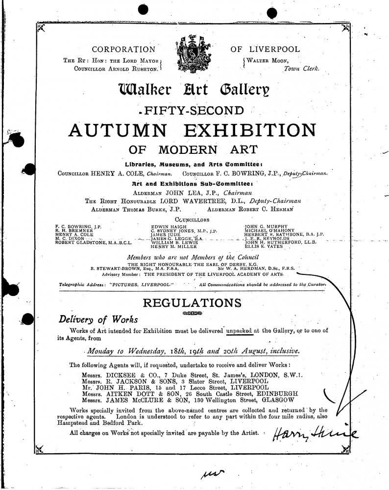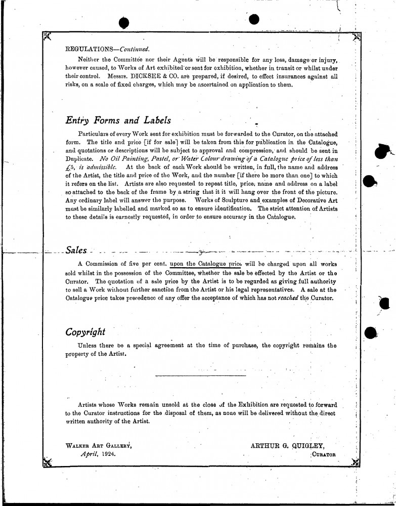 Regulations sent from Arthur G. Quigley, Curator of the Fifty-Second Autumn Exhibition of Modern Art at the Walker Gallery, regarding delivery of works, entry forms, sales commission and copyright.