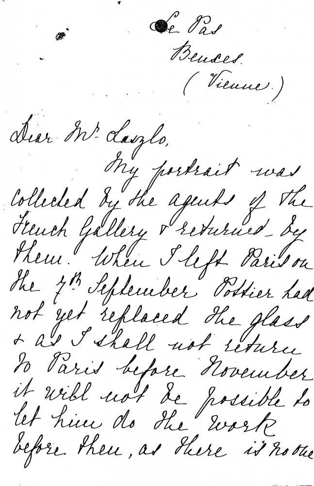 Issues concerning the glazing of Baronne Baeyens' portrait [2825] following its exhibition (French Gallery, June 1923).