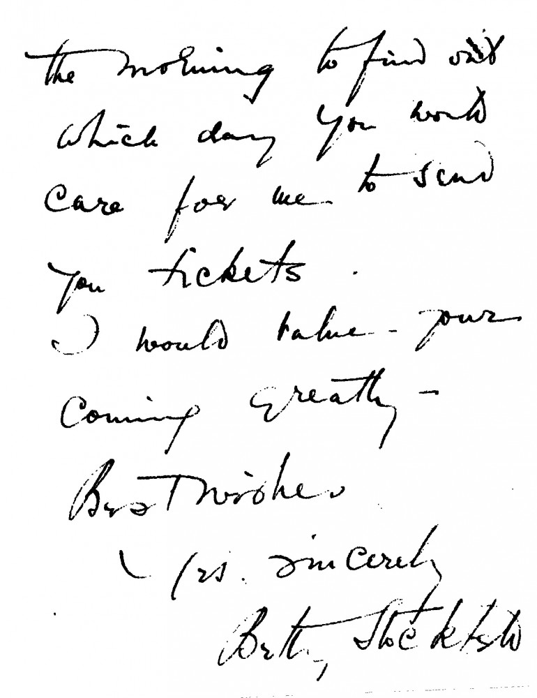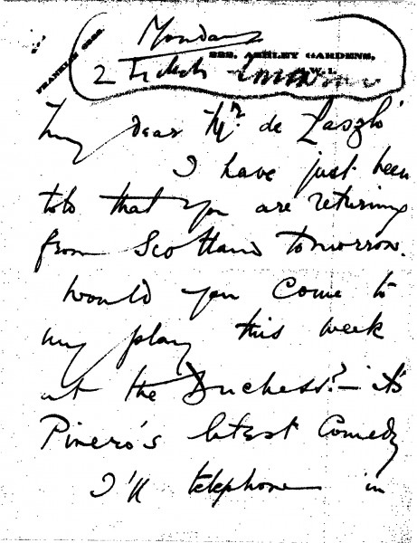Betty Stockfeld offers de László tickets to an Arthur Pinero comedy in which she stars.