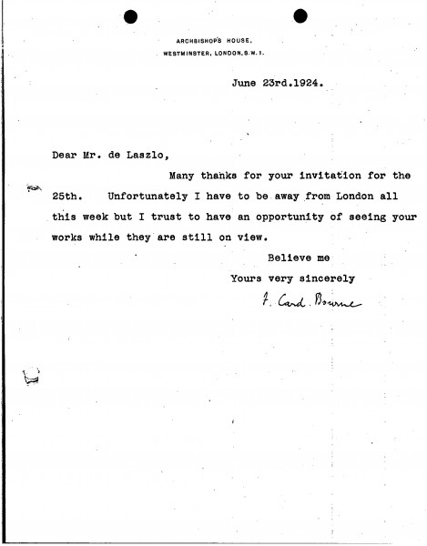 Cardinal Bourne regrets that he is unable to attend the private view of the artist’s exhibition (French Gallery, June 1924).