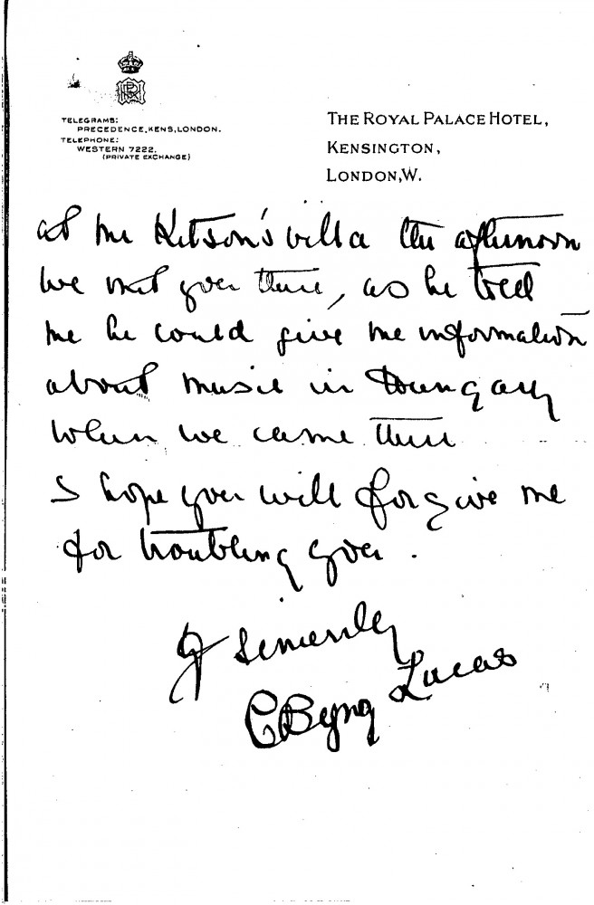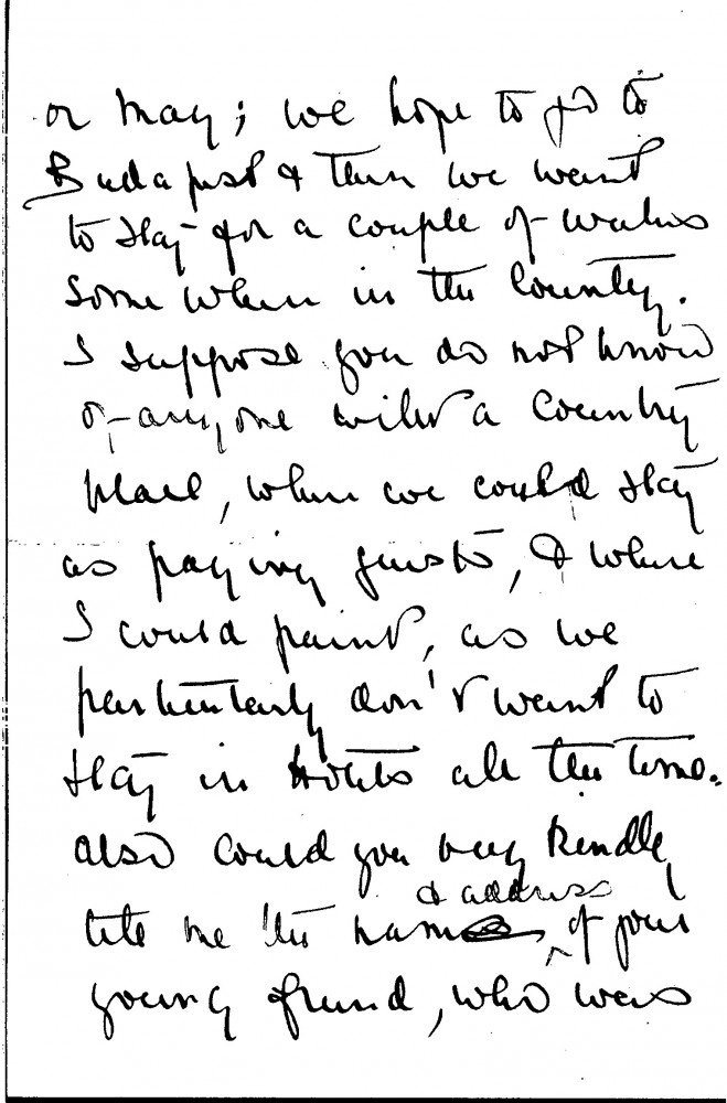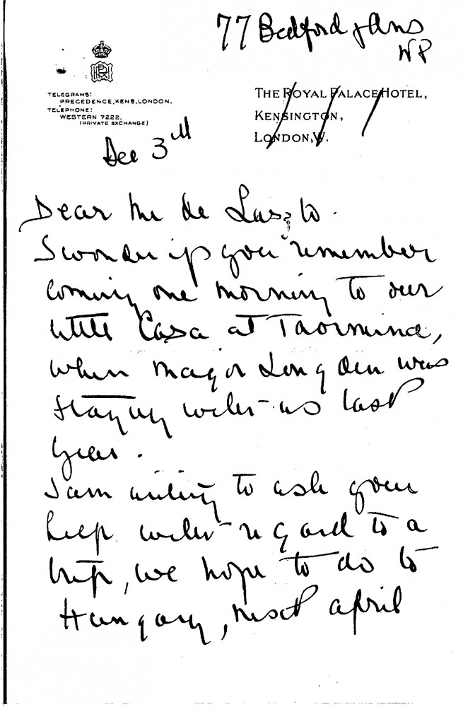 Caroline Byng Lucas recalls a past visit de László paid to her in Taormina and asks for help planning a trip to Hungary, ideally staying in the countryside where she can paint. She requests the details of an acquaintance she met at Mr. Kitson’s villa, who offered to share information about music in Hungary.