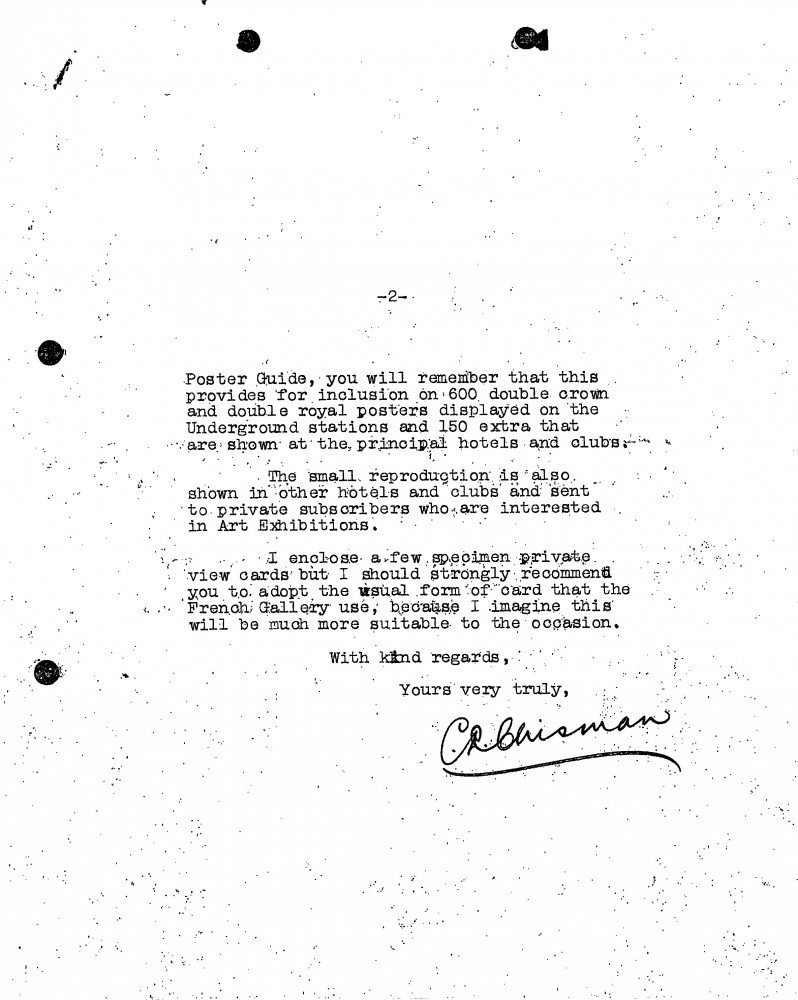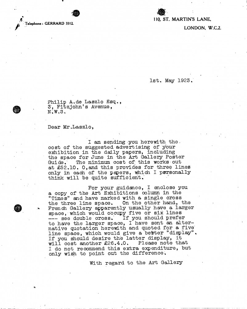 Regarding suggested advertising costs for de László's exhibition (French Gallery, June 1923).