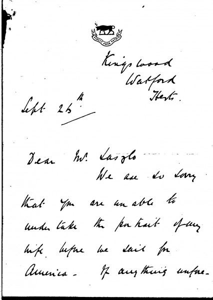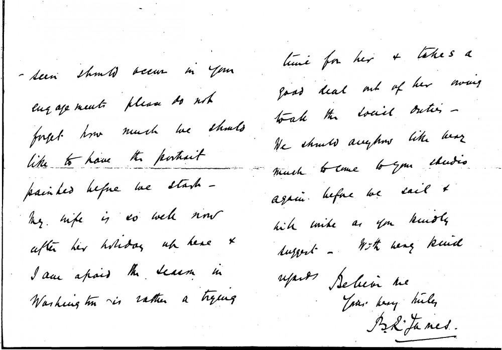 Bernard Ramsden James expresses regret that de László cannot paint his wife’s portrait before their departure for America, asks to be kept in mind should the artist’s schedule change, and hopes to visit the studio again before they sail.