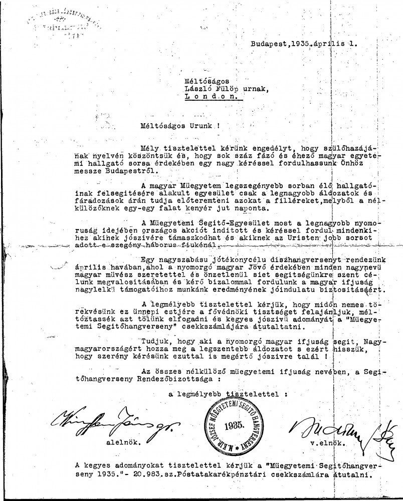 Letter from József Technical University’s Benevolent Society, asking de László to accept becoming a patron of their gala concert and to make a donation. Item includes a draft letter from de László to Jenő Hubay in which de László recalls fond memories of painting Hubay's wife's portrait [4825], and requests assistance in forwarding a letter to Sándor Budinszky (see related item DLA035-0129).