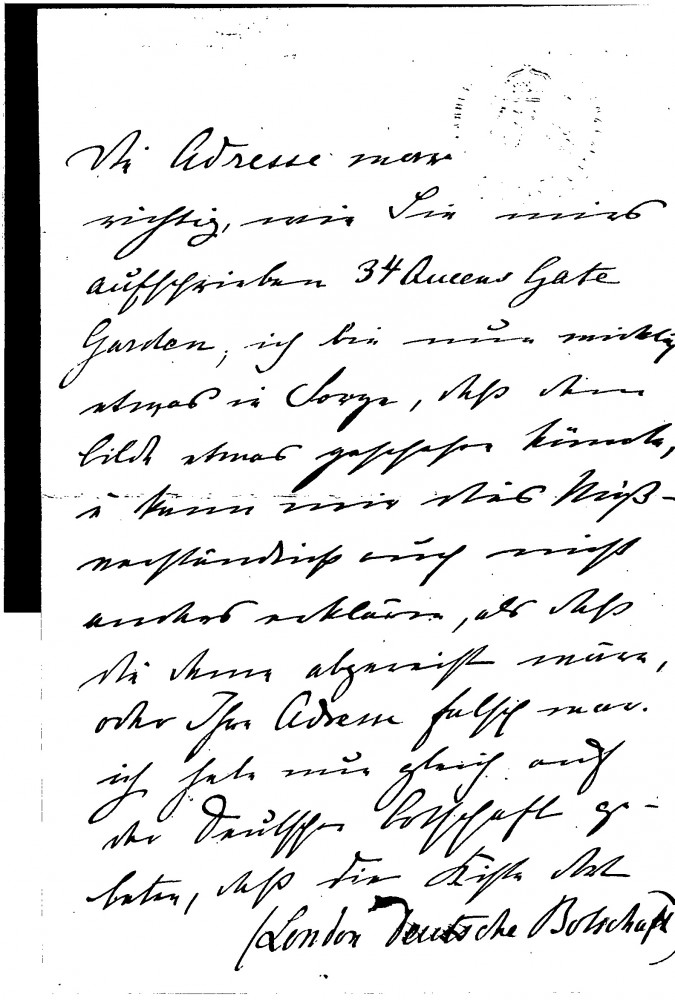 Countess Brockdorff’s picture arrived in London, but Eva Guinness could not be reached; she has asked the German embassy to store it temporarily and requests the box be collected for reproduction. His exhibition is eagerly anticipated (Schulte 1900). The Emperor, who approved portraits of the Empress [4960] and the Princess [5090] for inclusion, admired portraits of the Countess’ niece [4516] and brother-in-law [110793]. A reproduction of her sister’s portrait [possibly 111453] appears somewhat pale.
