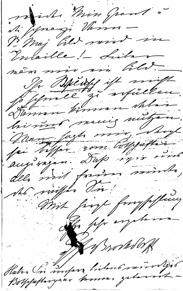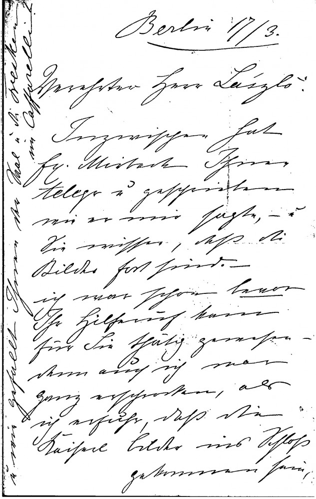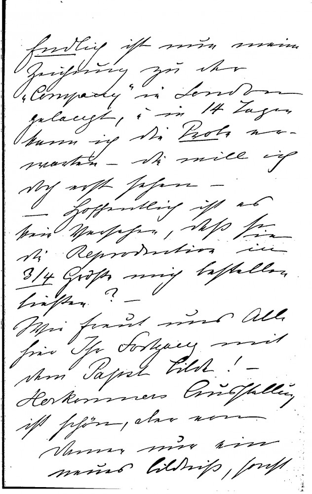 Countess Brockdorff reassures de László that Baron Mirbach is managing the situation with the imperial paintings at the Schloss, given his plans for Munich. She notes that the reproductions her sister saw in Vienna and Paris are acceptable, provides an update on her drawing arriving in London, expresses everyone’s delight at his progress on the Pope painting [4509], and comments on Herkomer’s exhibition.