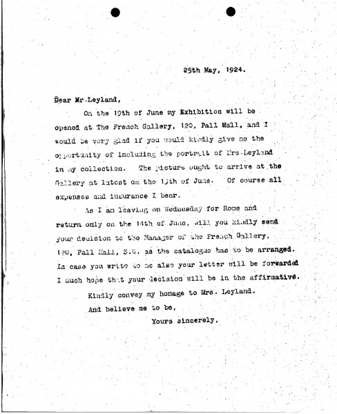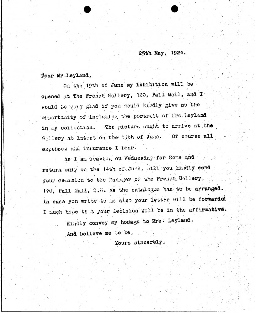 Requesting the loan of the portrait of Mrs Leyland [9975] for exhibition (French Gallery, June 1924).