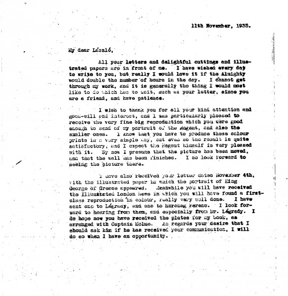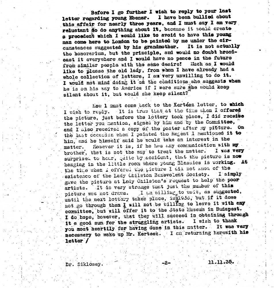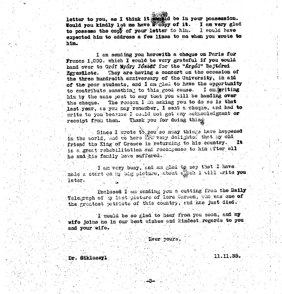 De László thanks Siklóssy for his letters and reproductions of the Regent’s portrait [110886]. Declines a request to paint Ede Virág-Ébner, citing concerns about setting a precedent. Expresses disappointment over the handling of a donated painting [6316] for a charity lottery, agreeing to wait for the next draw before possibly offering it to the State Museum. Includes a donation for the Árpád Bajtársai Association and asks Siklóssy to deliver it. Comments on the return of the King of Greece.