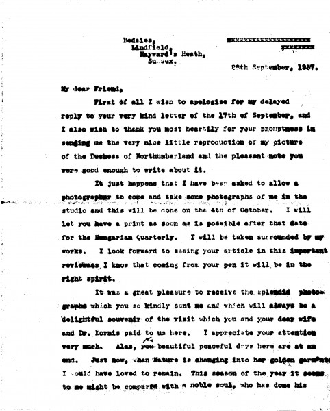 De László thanks Siklóssy for publishing his portrait of the Duchess of Northumberland [6868], promises to send a new studio photograph for the Hungarian Quarterly, and expresses gratitude for photos from Siklóssy’s visit. Reflects poetically on the end of summer, mentions preparations for his upcoming exhibition (Wildenstein, 1937), and notes plans to travel to the South of France to paint Légrády.