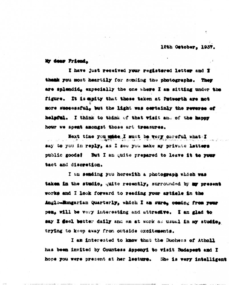 De László thanks Siklóssy for the photographs taken at Petworth, and shares updates on his health and studio work. Mentions a lecture given by the Duchess of Atholl in Budapest.