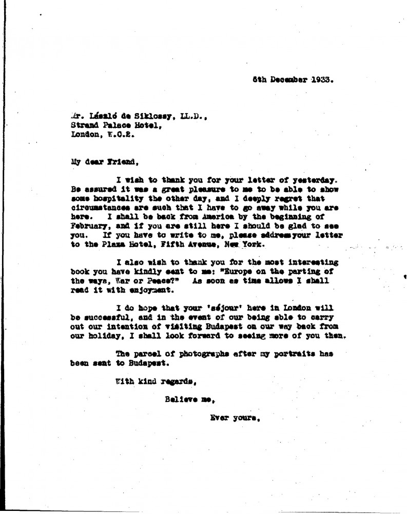 Multiple pieces of correspondence. Letter dated 5 December 1933: Siklóssy thanks de László for their recent meeting, sends a publication titled "Europe on the Parting of the Ways, War or Peace?", suggesting they revisit it after de László's return in spring. Letter dated 6 December 1933: De László thanks Siklóssy for the book, regrets having to leave for America and hopes to meet again either in London or Budapest. Photographs of his portraits have been sent to Budapest.
