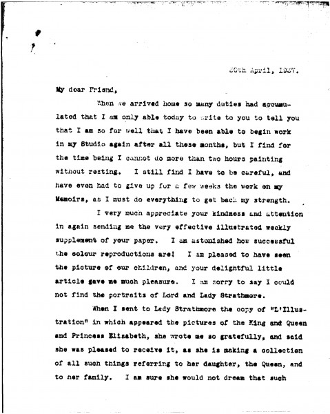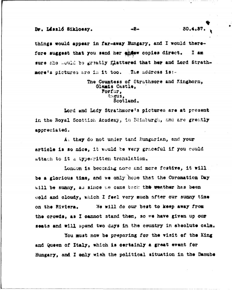 De László has resumed painting but must limit his work due to ongoing recovery. Thanks Siklóssy for sending an illustrated supplement, praises its reproductions, and suggests sending copies to Lady Strathmore. Comments on the success of the Strathmore portraits in Edinburgh [11642][11641], the upcoming Coronation festivities in London, and the political situation in Europe.