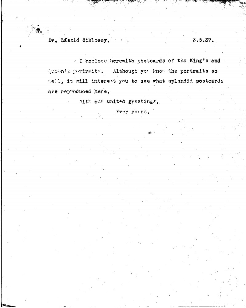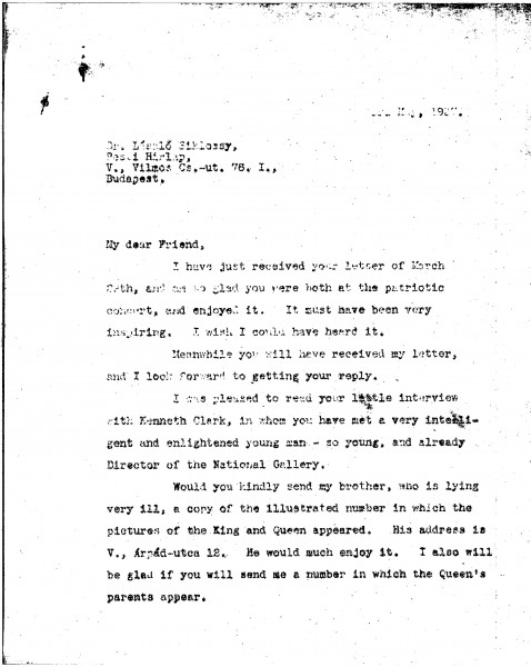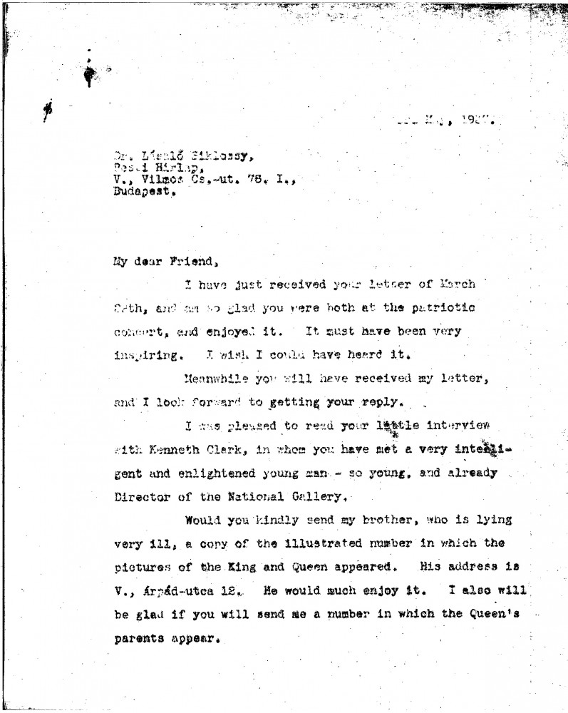De László thanks Siklóssy for attending a concert and for sending an interview with Kenneth Clark. Requests a copy of the illustrated issue featuring the King and Queen’s portraits be sent to his ill brother and requests another issue illustrating the Queen’s parents.