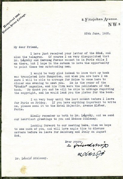 De László is disappointed Légrády and Herczeg cannot be in Paris but hopes to paint them in the autumn. Welcomes news of the Hungarian translation of his book, "Painting a Portrait", and offers to arrange a meeting with publisher Charles Holme to discuss. Details upcoming travel plans.