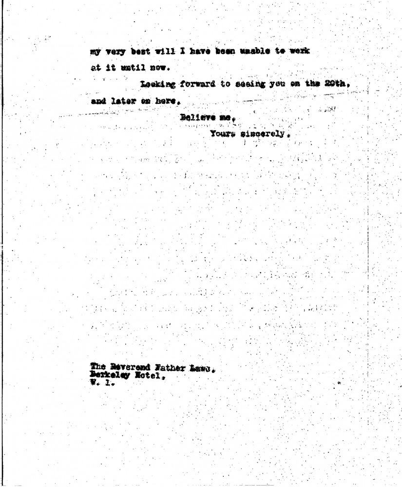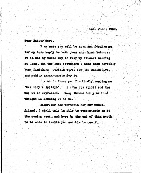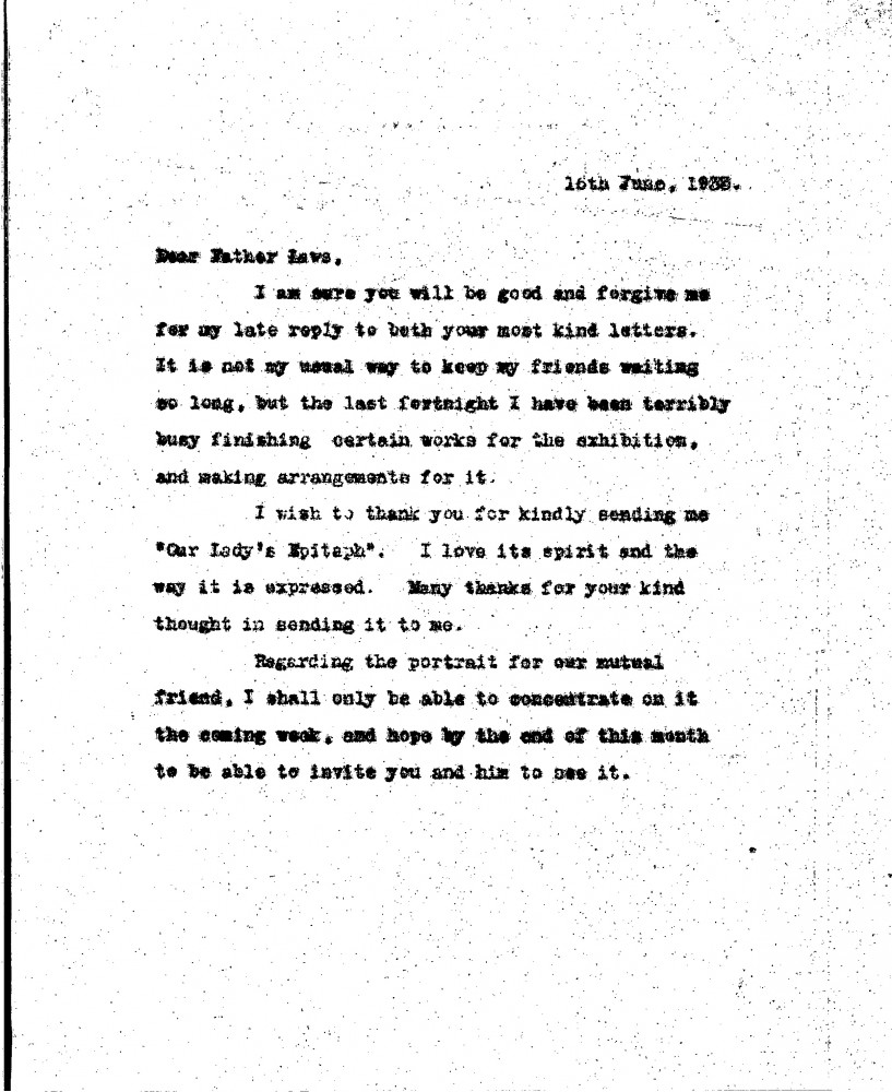 De László apologises for his delayed reply and thanks Father Laws for sending 'Our Lady’s Epitaph' (see DLA020-0259). Will resume work on the portrait soon [9806], hoping to share it by the end of the month.