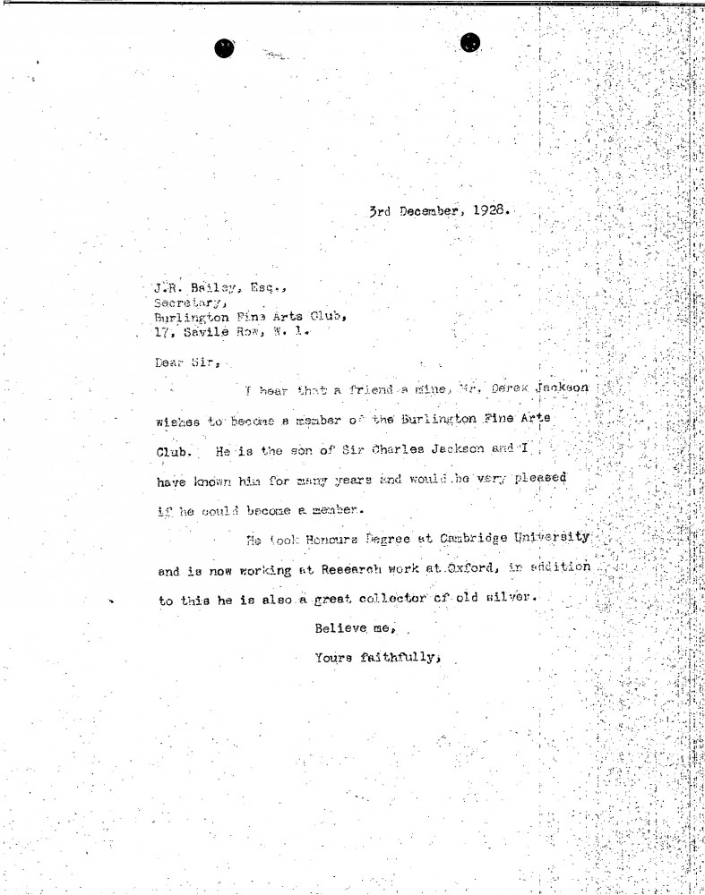 De László recommends Derek Jackson for membership to the Burlington Fine Arts Club, noting his academic background, research work at Oxford, and interest in collecting silver.