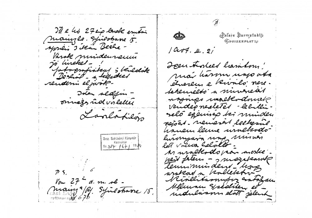 De László has been enjoying his time with the Grand Duke of Hesse, describing him as a "fascinating person, an enthusiast for all that is beautiful and noble"; he will try to include portraits of the Grand Duke and Duchess [5937][5933] in his forthcoming exhibition; shipping (and framing) arrangements for the exhibition (Nemzeti Szalon, 1907).