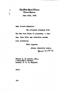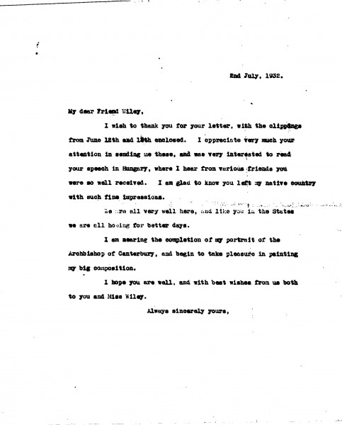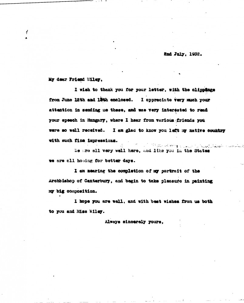 De László thanks Louis Wiley for clippings relating to his trip to Hungary, notes he is finishing the Archbishop of Canterbury portrait [6161], and refers to the War Picture.