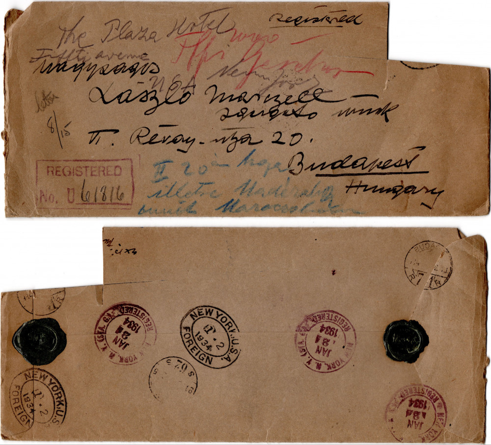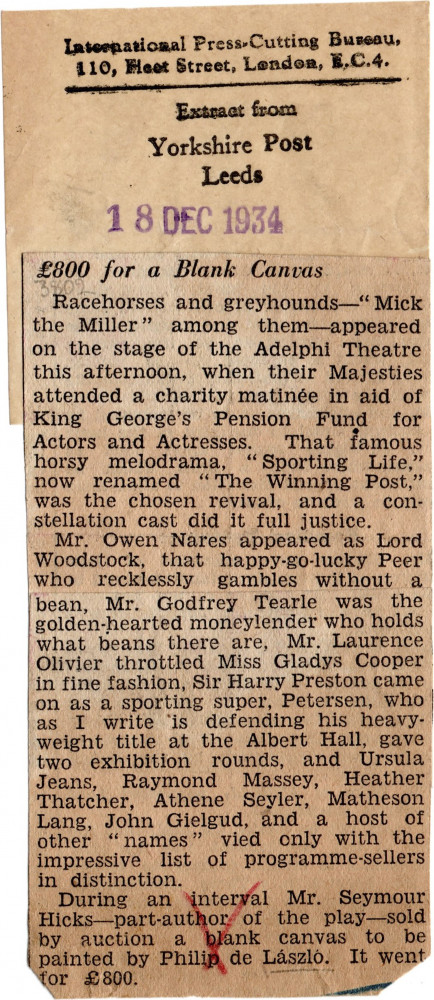 Letter from de László to Marczell 'Marczi' László. Description of his visit to America. Made a broadcast on the history of portrait painting. Donation to London hospital [6272]. Thanks Marczi for letting the Hungarian government have his picture of General Görgei [110815]. Ongoing problems of care for Marczi's nephew. Includes a press cutting from the "Yorkshire Post" (18 December 1934) concerning the auction of a blank canvas by de László for £800.