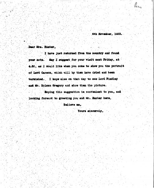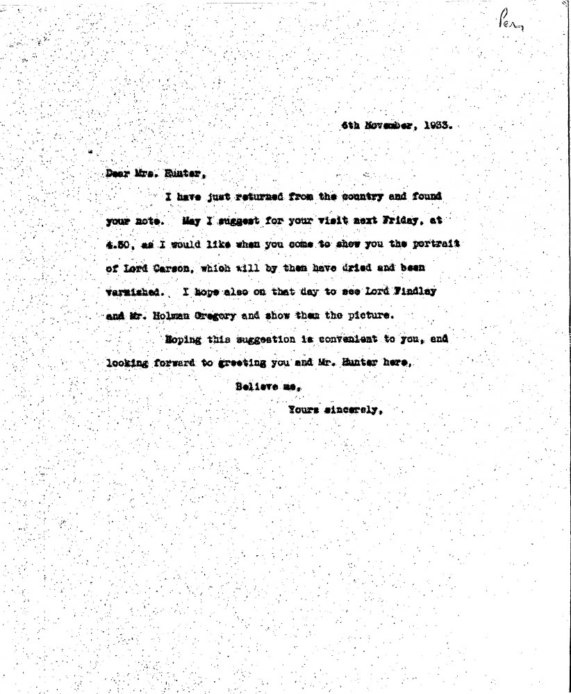 De László suggests a date to view Lord Carson’s finished portrait [3975] in his studio; he also plans to show it to Lord Findlay and Holman Gregory on the same day.