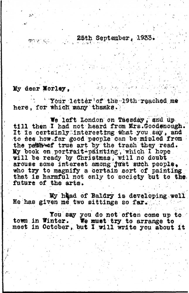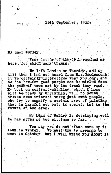 De László has not heard from Mrs Goodenough concerning a potential portrait commission, agrees that public taste is often misled by popular media, mentions his forthcoming book on portrait painting, and reports progress on his bust of Baldry [3583].
