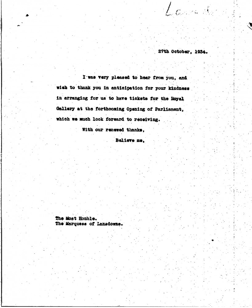 De László thanks Lord Lansdowne in advance for arranging tickets for the opening of Parliament.